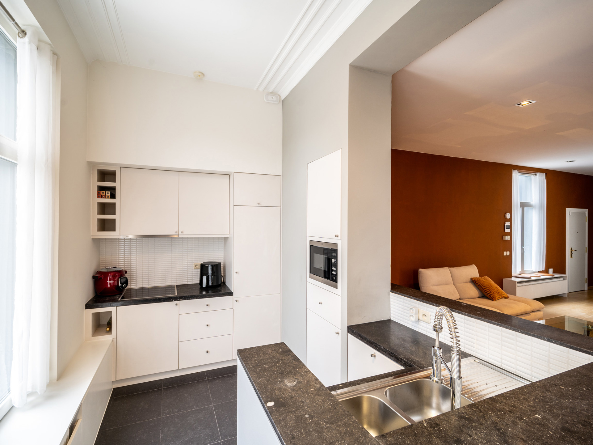 The apartment located on the second rear floor of a Neo-classical inspired mansion opens onto an entrance hall with cloakroom and guest toilet and leads to the living space offering beautiful high ceilings and extended by a fully equipped open kitchen offering an unobstructed view of Egmont Park. On the night side, the master bedroom with built-in wardrobes and full bathroom, a second bedroom and a laundry area.