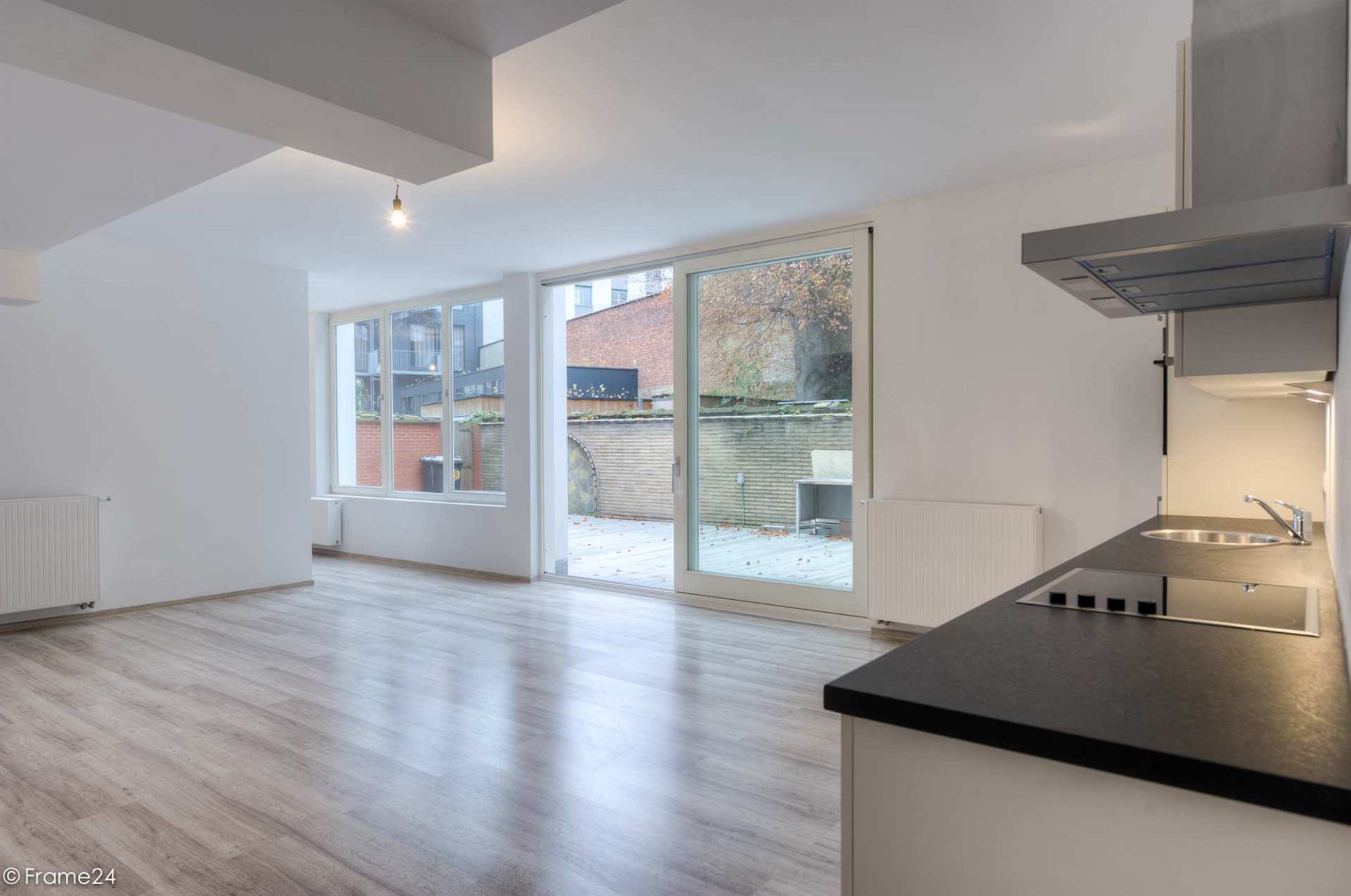 Dit ruime appartement is gelegen op het gelijkvloers van een gerenoveerd pand met in de gemeenschappelijke gang in een prachtige art deco stijl. U komt binnen in het appartement waar u ruimte hebt om een mooie vestiaire te plaatsen. Vanuit de inkomhal hebt u toegang tot de ruime leefruimte (ca. 38 m²) met aansluitend de open keuken die over alle comfort beschikt: een vaatwasser, een ijskast, een oven en een keramische kookplaat. Vanuit de leefruimte kan u de grote raampartijen openschuiven en komt u terecht op het enorme terras van maar liefst 50 m². Verder hebt u een ruime slaapkamer van ca. 20 m² met een aparte open ruimte die perfect kan gebruikt worden als dressing of als bureau. U hebt toegang tot de badkamer vanuit de slaapkamer. De badkamer omvat een lavabo met spiegel, een toilet en een douche. Ook is er nog een apart toilet voorzien en een bergruimte waar u een wasmachine kan aansluiten. Tenslotte hebt u nog een ruime private kelderruimte en kan u de fiets ook opbergen in de fietsenstalling.