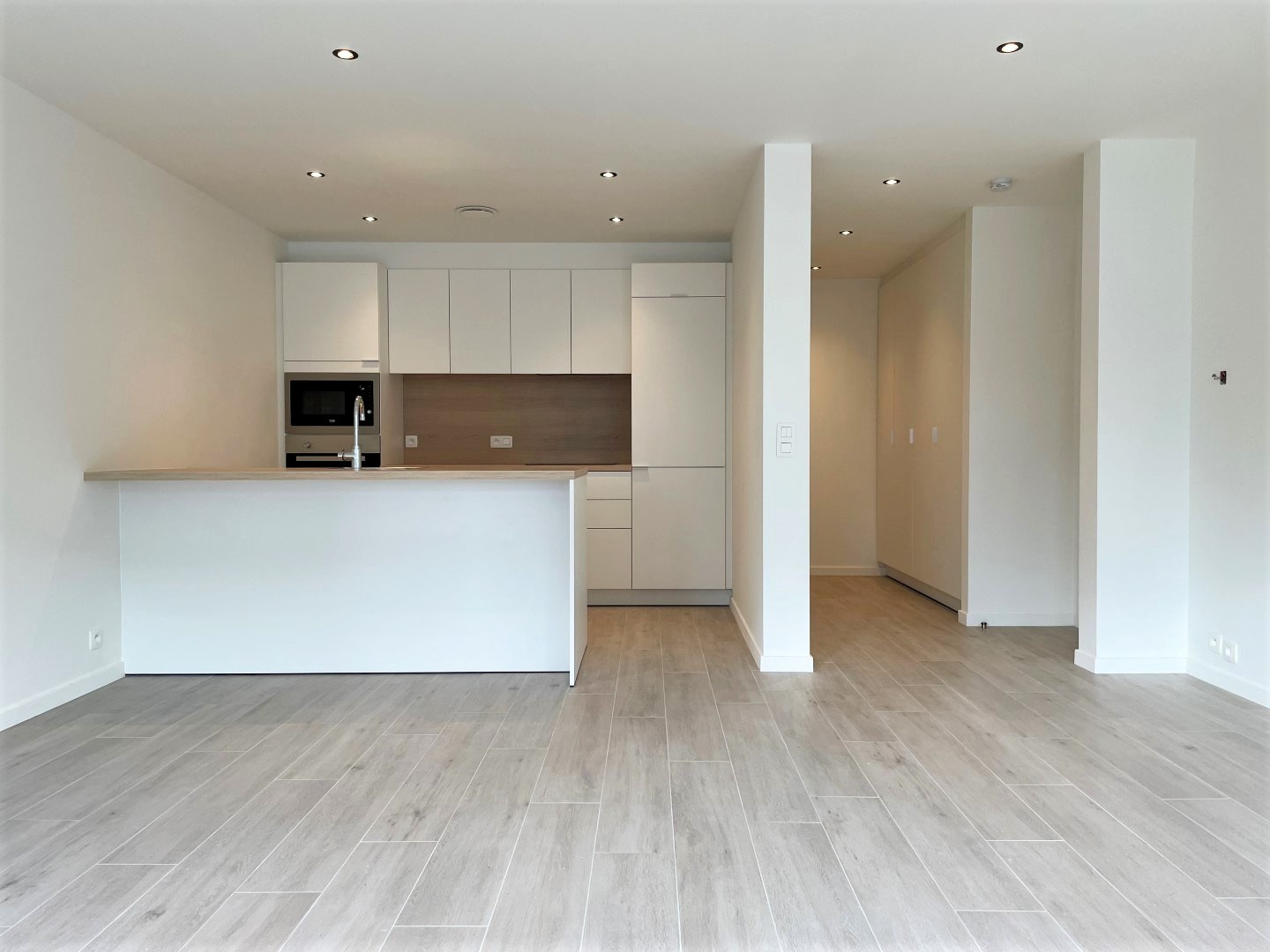 Erg lichte woonkamer met aansluitend de open keuken. Deze is voorzien van alle nodige snufjes: koelkast, vriezer, keramisch fornuis, afzuigkap, vaatwasser, oven, magnetron en een spoelbak.