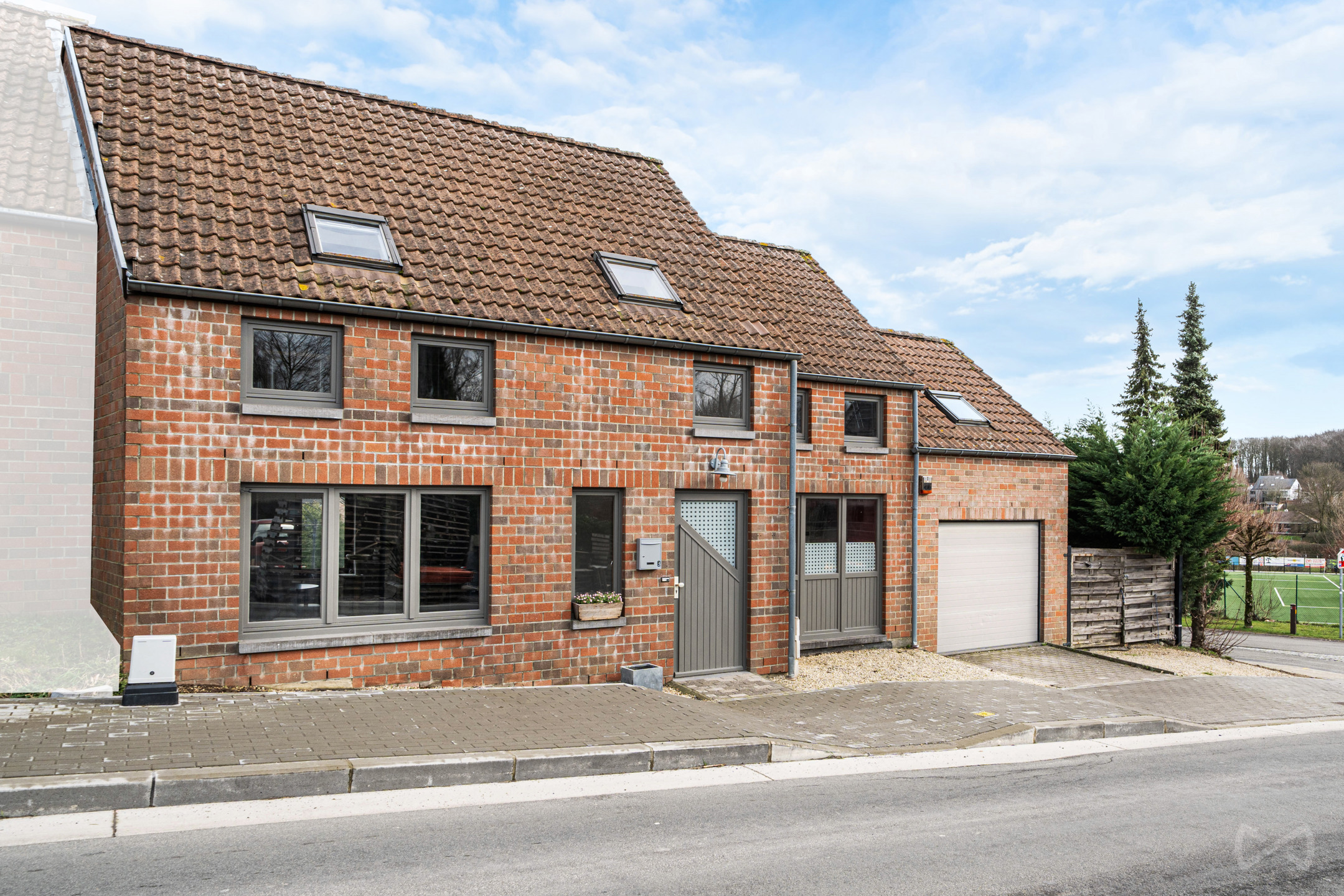 On the ground floor, you will find an entrance hall with separate toilet and cloakroom, a bright living room with wood-burning cassette and dining area providing access to the outside, a fully equipped kitchen with laundry room, as well as a garage with sectional door.