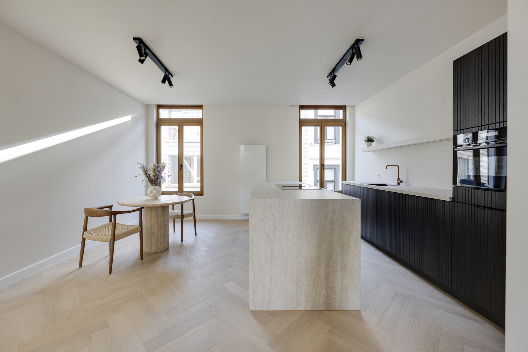 Bij het binnenkomen betreed je de grote leefkeuken met uitnodigend keukeneiland, dé perfecte plek om vrienden te ontvangen of uitgebreid te tafelen. De open indeling laat toe om een gezellige eethoek te creëren, terwijl de hoge plafonds en grote ramen voor een luchtig, lichtgevoel zorgen.