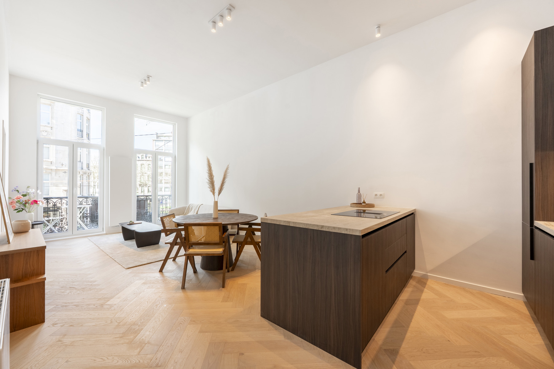 Zodra je de deur opent, word je verwelkomd door een prachtige visgraatparketvloer die door het hele appartement loopt. De grote raampartijen met charmante Franse balkons zijn echte blikvangers; ze zorgen niet alleen voor een overvloed aan natuurlijk licht, maar ook voor een levendig uitzicht op de karaktervolle stadsarchitectuur. De open leefruimte stroomt moeiteloos over in de moderne keuken met donkere kasten en lichte werkbladen, de ideale plek om te koken terwijl je vrienden alvast een wijntje inschenken.