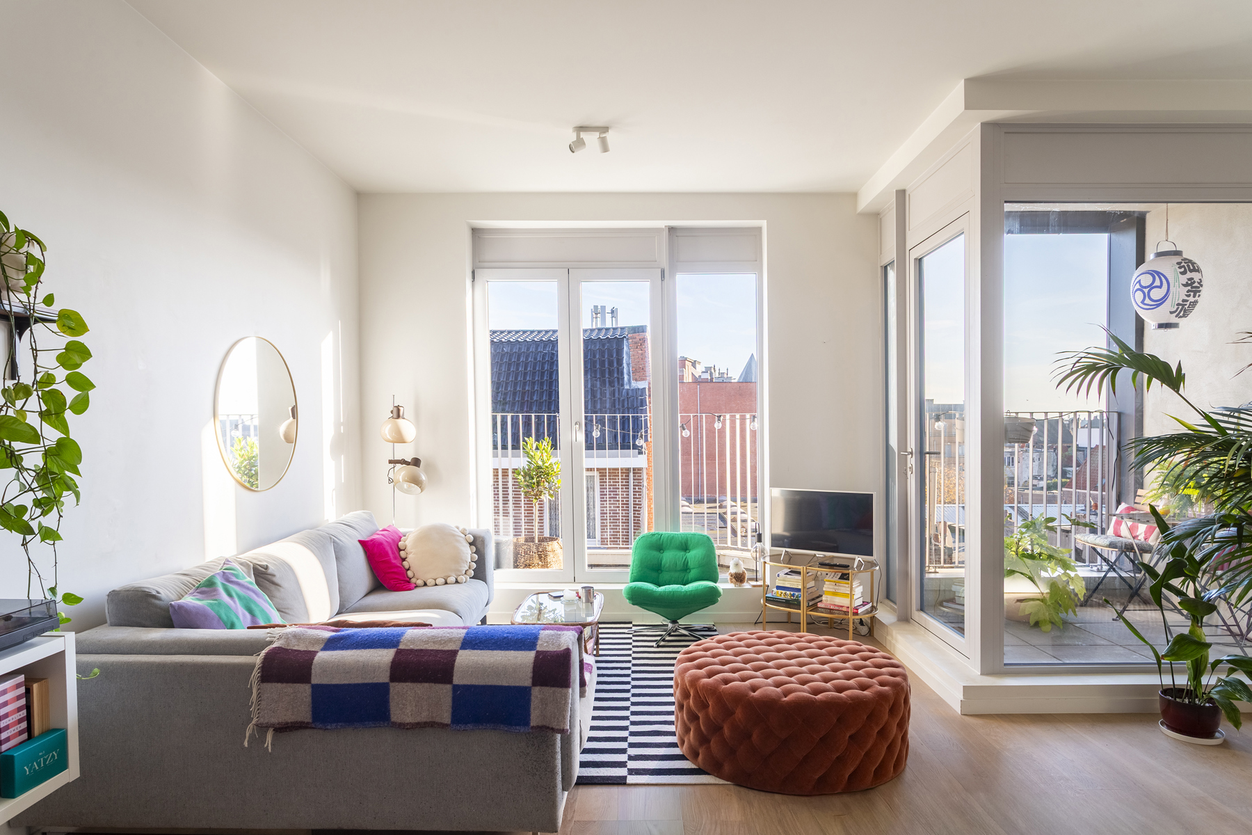 As you enter, you are immediately embraced by natural light. The spacious living and dining room, with high ceilings and generous windows, is bathed in sunlight throughout the day while feeling warm and elegant. From the living area, you step onto the cosy enclosed terrace, where you can enjoy a sheltered outdoor moment all year round. Adjacent is the stylish open kitchen with kitchen island, perfectly laid out and equipped with quality appliances. Ideal for a quick bite, a full dinner or drinks with friends.