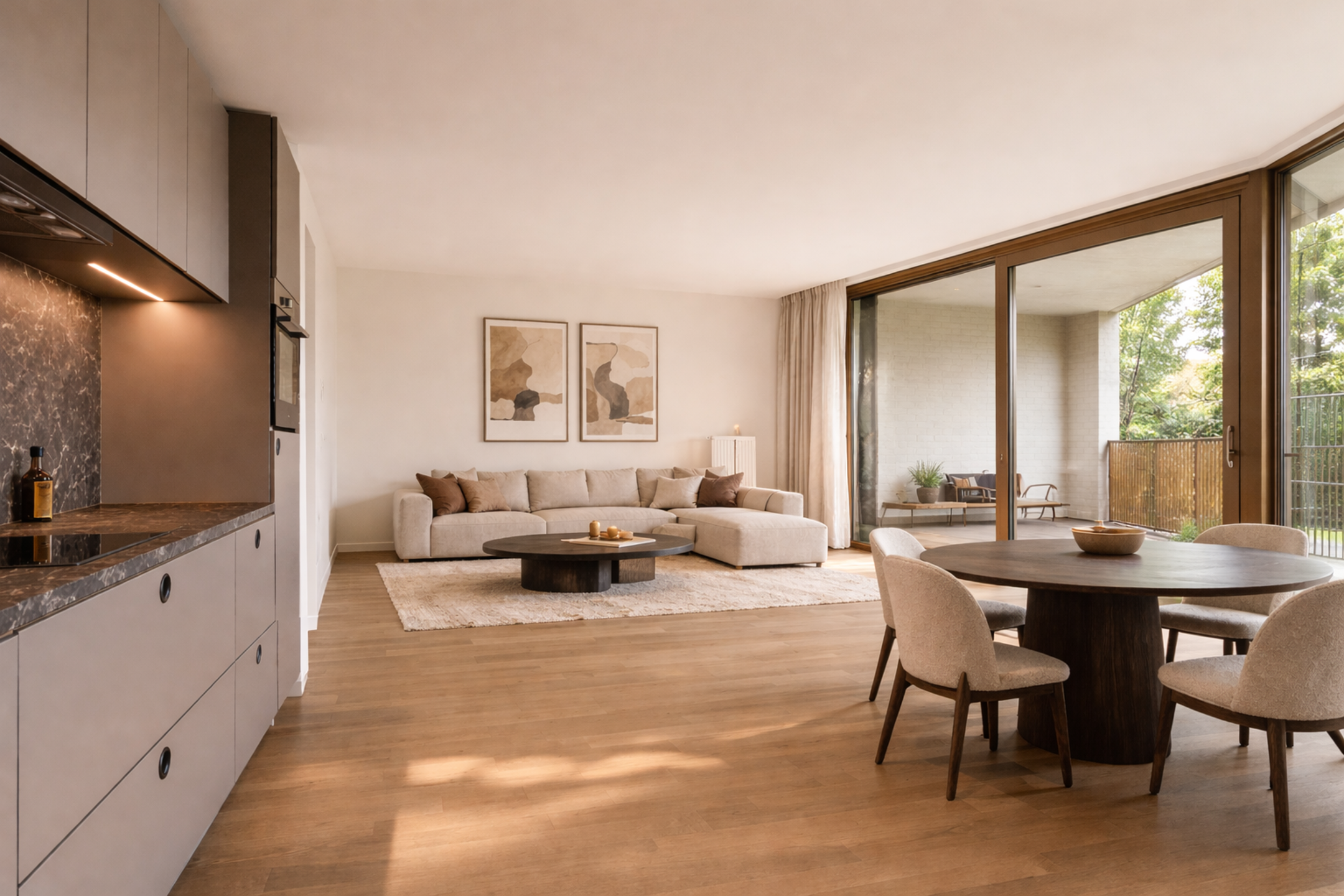The generous living area is highlighted by large sliding windows offering an open view of the terrace and the adjacent communal garden. Thanks to the west-facing orientation, the terrace is perfect for enjoying the evening sun.