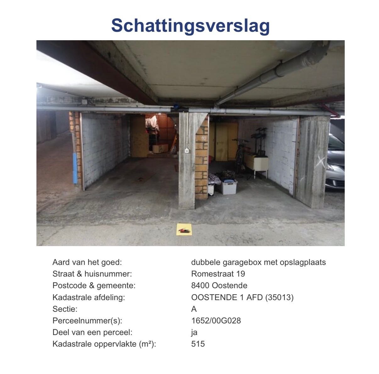 Dubbele garagebox met aansluitende bergruimte. Gelegen op -1 met automatische poort naar straat.