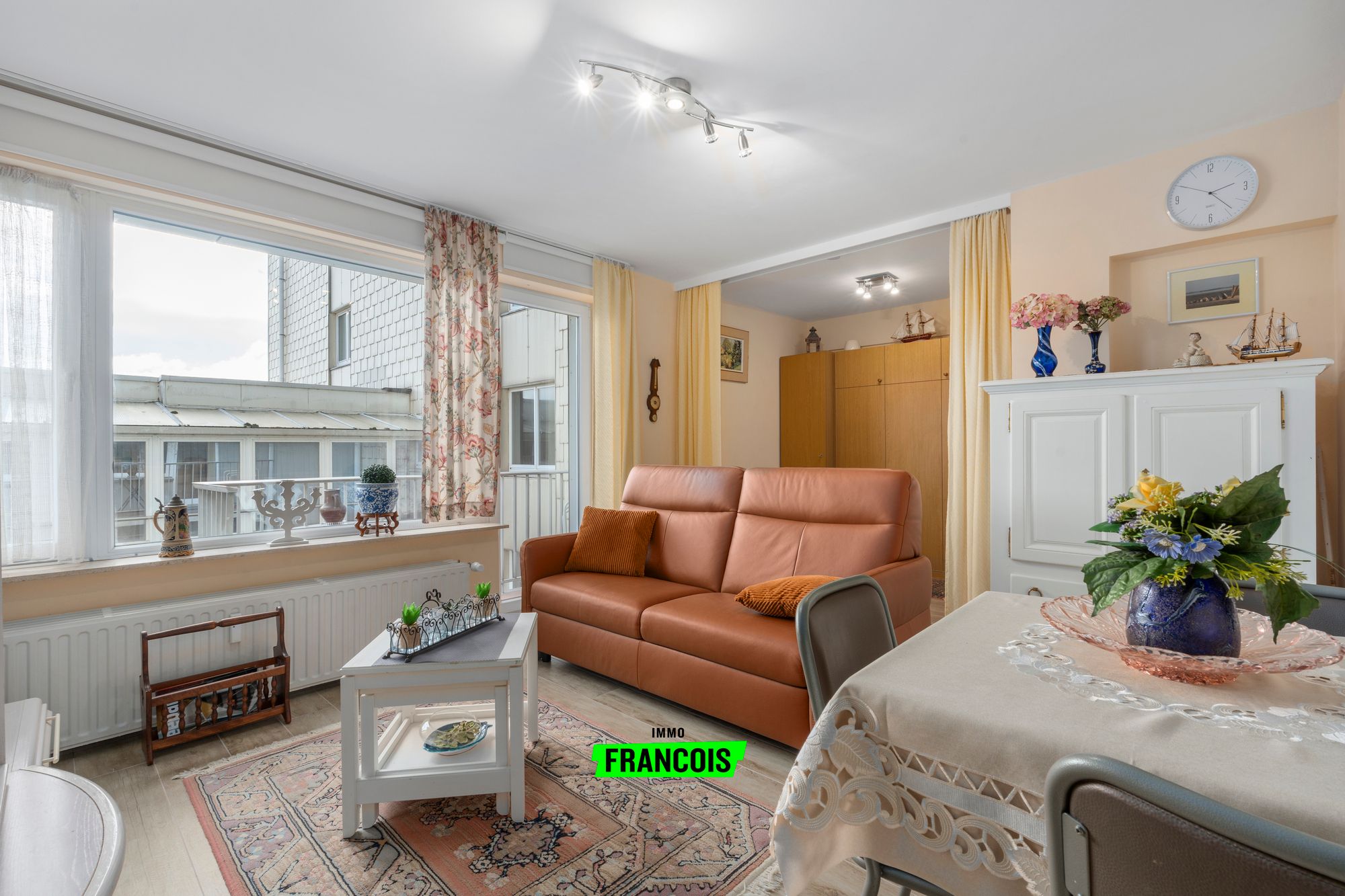 De studio met vernieuwde vloer beschikt over een vernieuwde keuken met moderne toestellen en een lichtrijke leefruimte die uitgeeft op een zonnig terras, waar u in alle rust kunt genieten van de buitenlucht. De aparte slaaphoek zorgt voor extra comfort en privacy.