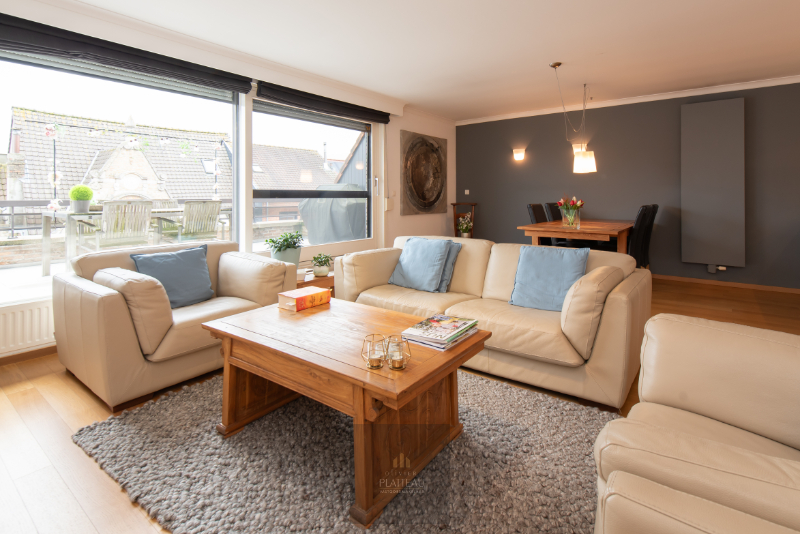 Beautiful apartment (107m²) with 3 bedrooms and large terraces located on the 3rd floor of the Halletorre residence, very centrally located in Marktstraat, just 150 metres from the market. This flat comprises: Entrance hall, cloakroom, separate toilet, spacious living room opening onto the sunny terrace (21m²) in Marktstraat, fully fitted open-plan luxury kitchen, renovated bathroom with washbasin and walk-in shower, master bedroom with fitted wardrobes and 2nd bedroom opening onto the rear terrace (21m²), 3rd bedroom or office. Floor plan attached. EPC 179 kWh/m². Asking price: 398000 Euro.