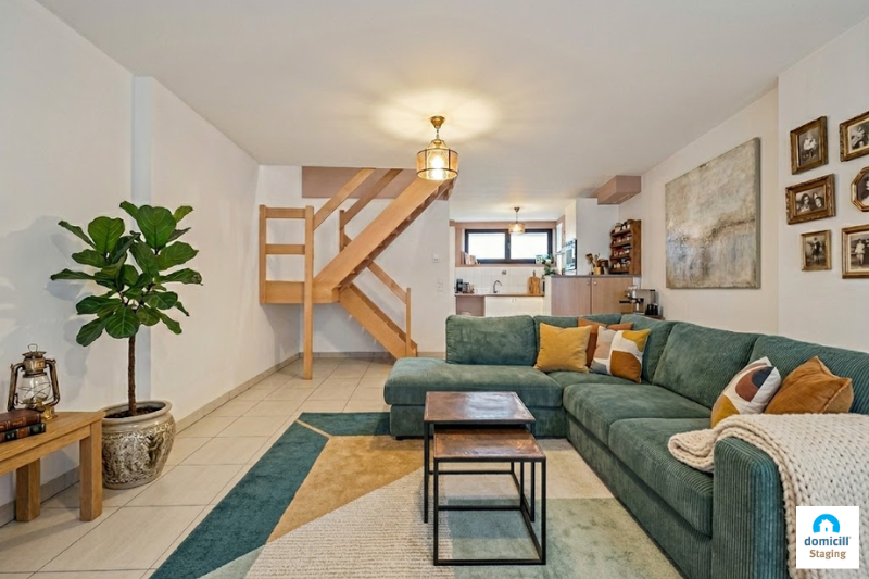 Gelijkvloers: inkomhal, lichtrijke woonkamer met aansluitende geïnstalleerde keuken en vooraan een terras.