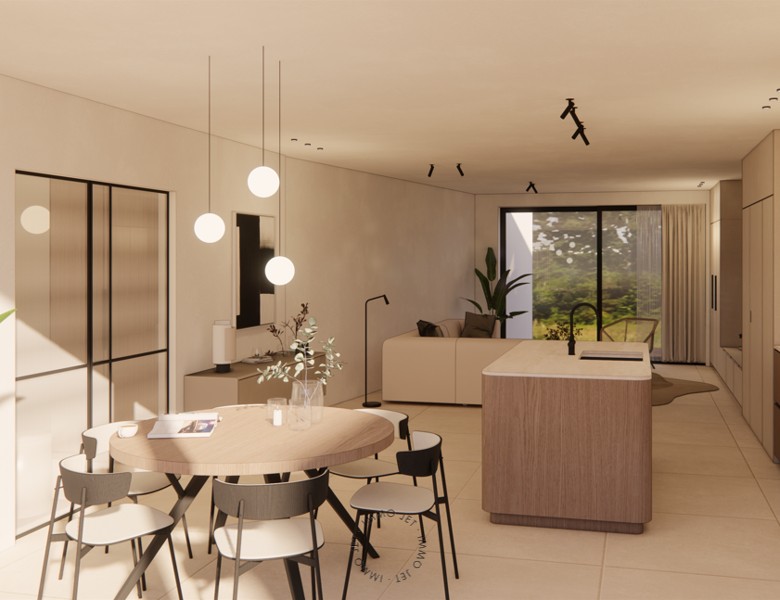 - Een elegante leefruimte met grote raampartijen en open keuken