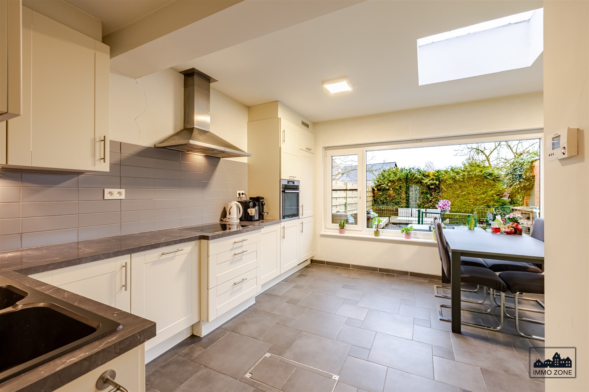 De keuken is een echte leefkeuken: ruim, lichtrijk en uitgerust met alle nodige toestellen. De aanwezige lichtkoepel zorgt voor extra natuurlijk licht. Naast de leefruimte is er een aparte berging met aansluitingen voor wasmachine en droogkast, evenals extra opbergruimte.