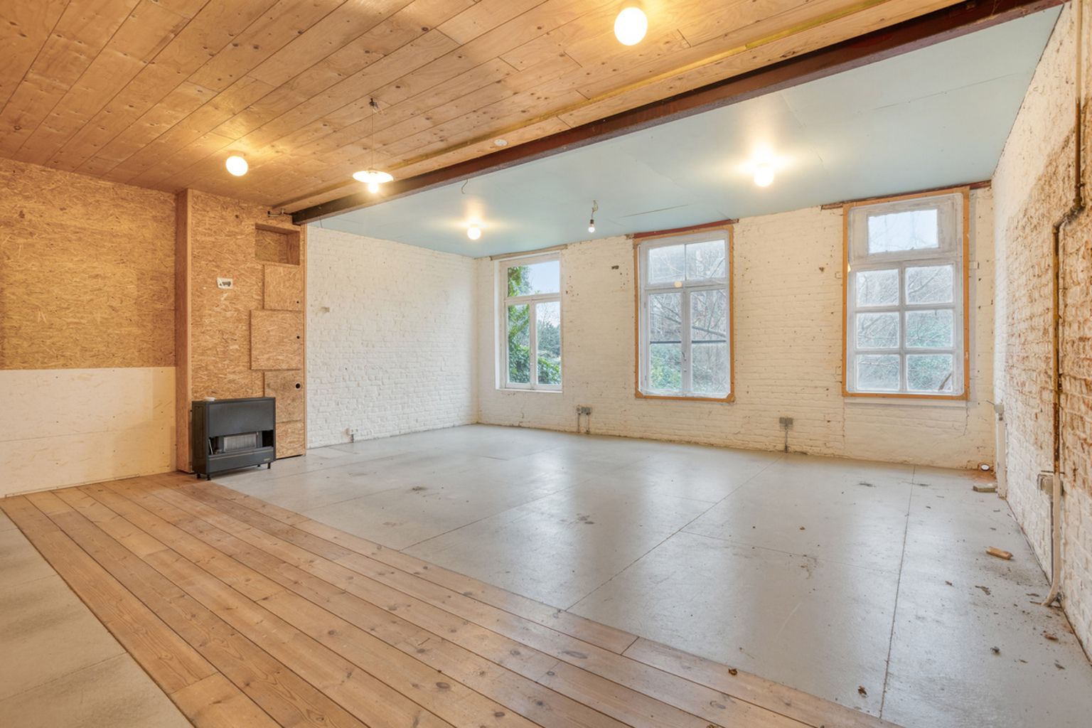 À gauche, côté rue : espace bureau/magasin (± 18 m²) avec, en enfilade, un bureau arrière (± 17 m²) avec mezzanine (± 14 m²), suivi d’une cuisine et salle à manger (± 17 m²) avec également une mezzanine (± 8 m²).