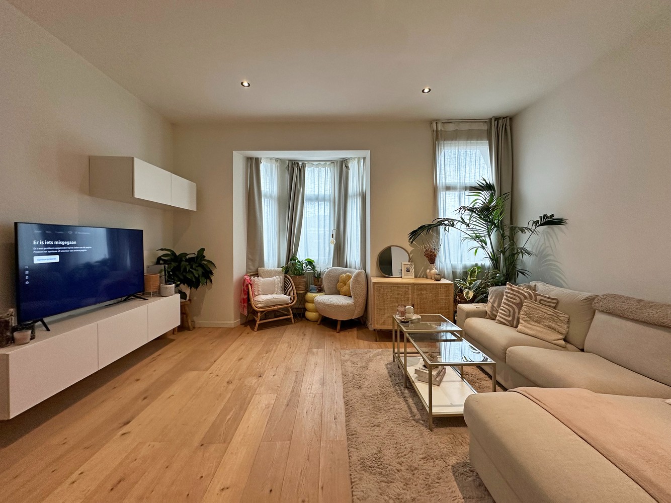 U betreedt het appartement en komt binnen ter hoogte van de keuken. Het appartement werd voorzien van een stijlvolle open keuken, voorzien van alle toestellen (vaatwasser, koelkast, diepvries, kookplaat, dampkap, lavabo met thermostatische kraan, hete luchtoven) en beschikt over een composieten werkblad met marmerlook. Vooraan heeft het appartement een erker van waaruit je een leuk zicht geniet op de straat en over gelegen pleintje. De leefruimte biedt voldoende ruimte tot het plaatsen van een leuke zithoek alsook eettafel.