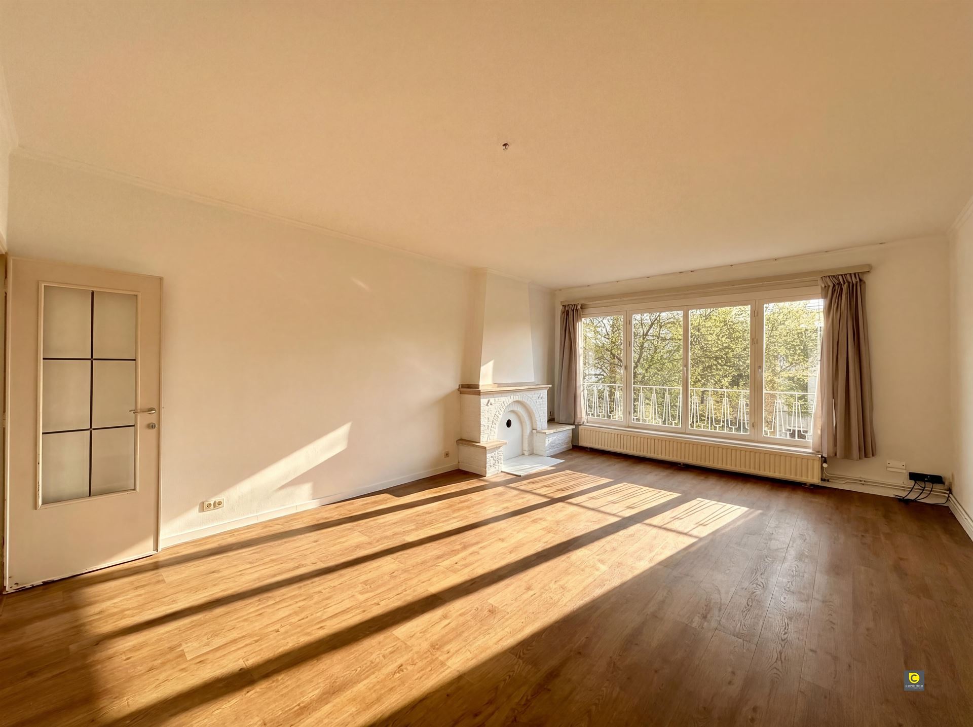 Le salon spacieux et lumineux est doté d'un élégant revêtement de sol stratifié et d'une cheminée décorative de caractère, qui lui confère une atmosphère chaleureuse et accueillante. Grâce aux grandes fenêtres, l'espace de vie bénéficie d'une lumière naturelle abondante.