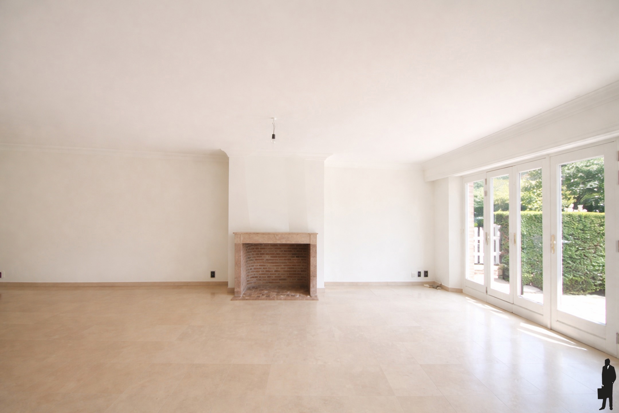 - Vervolgens heeft u toegang tot een ruime leefruimte (ca.45m²) op beige natuursteen. Via opslaande deueren heeft u toegang tot het voorliggend terras.