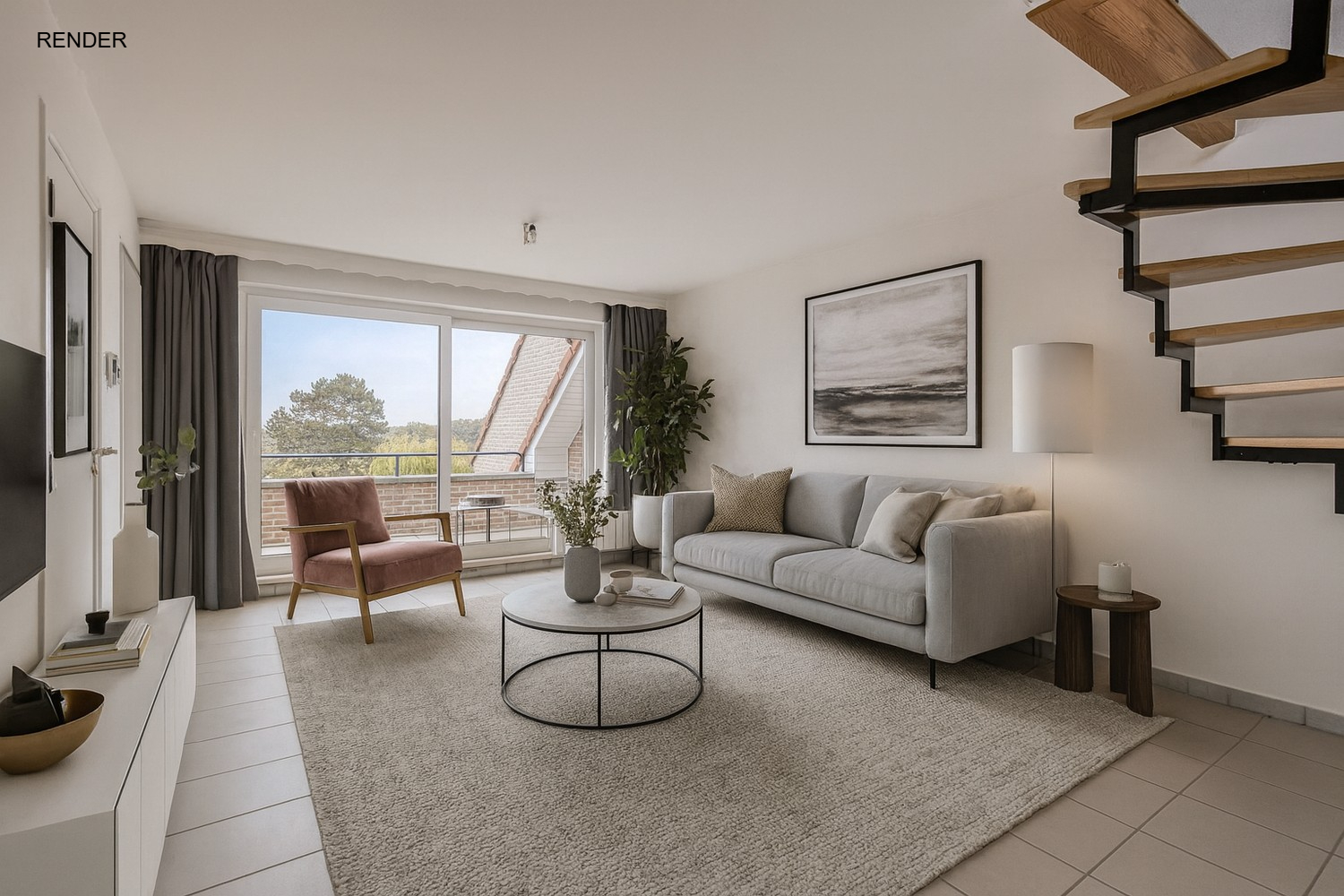 Vanuit de hal bereikt u de aangename leefruimte, die dankzij de grote raampartijen baadt in natuurlijk licht.