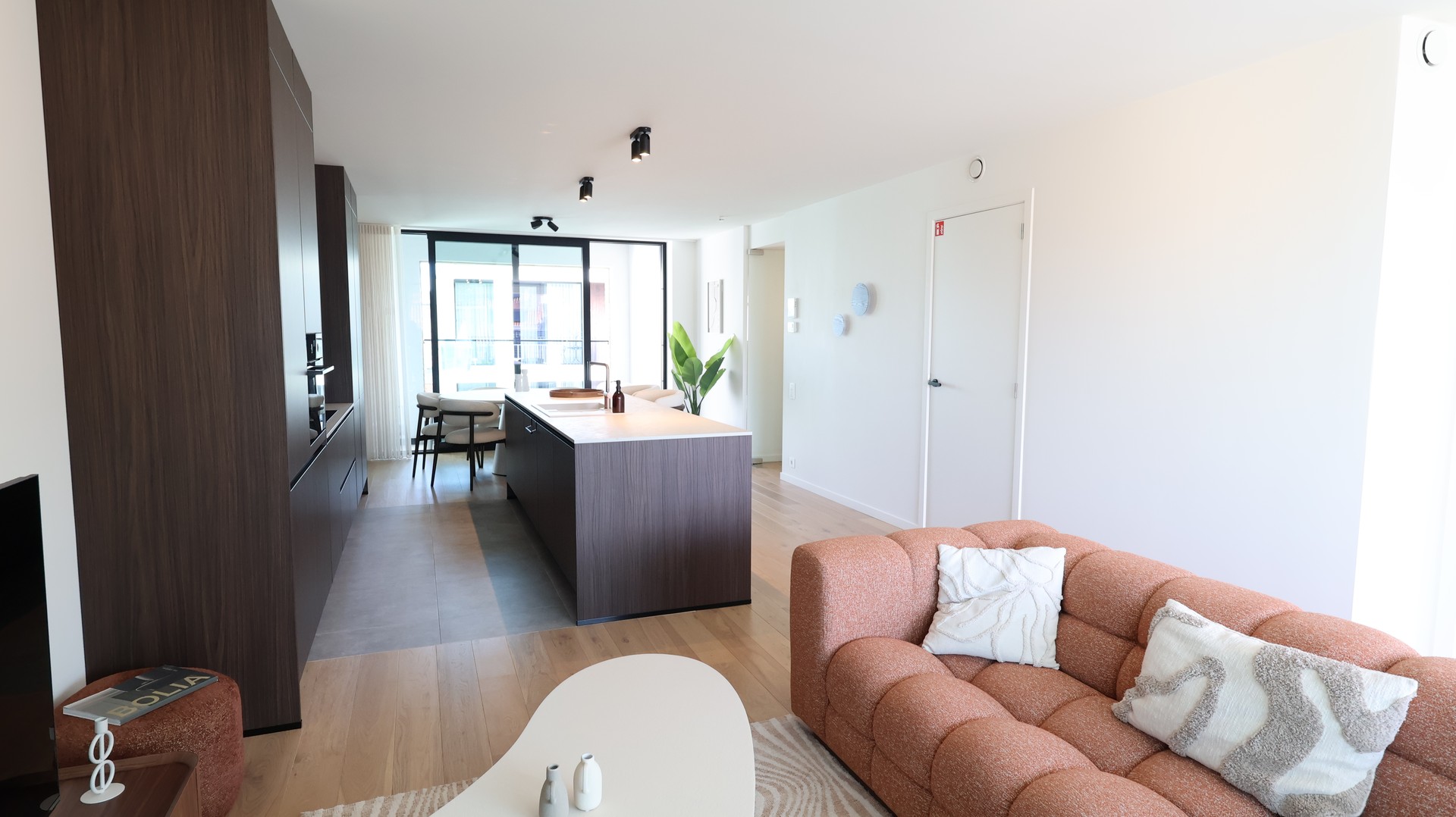 Het appartement beschikt over een ruime woonkamer met een open, moderne keuken, uitgerust met spoelbak, kookplaat, combi-oven en een ingewerkte dampkap met koolstoffilter. Aansluitend is er een praktische berging.
