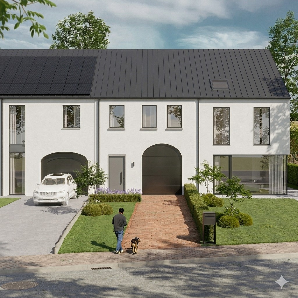 👉 Om het potentieel maximaal te tonen, werden renderbeelden toegevoegd van mogelijke woningtypes (modern / landelijk). Deze zijn louter illustratief, maar geven een realistisch beeld van wat hier mogelijk is.