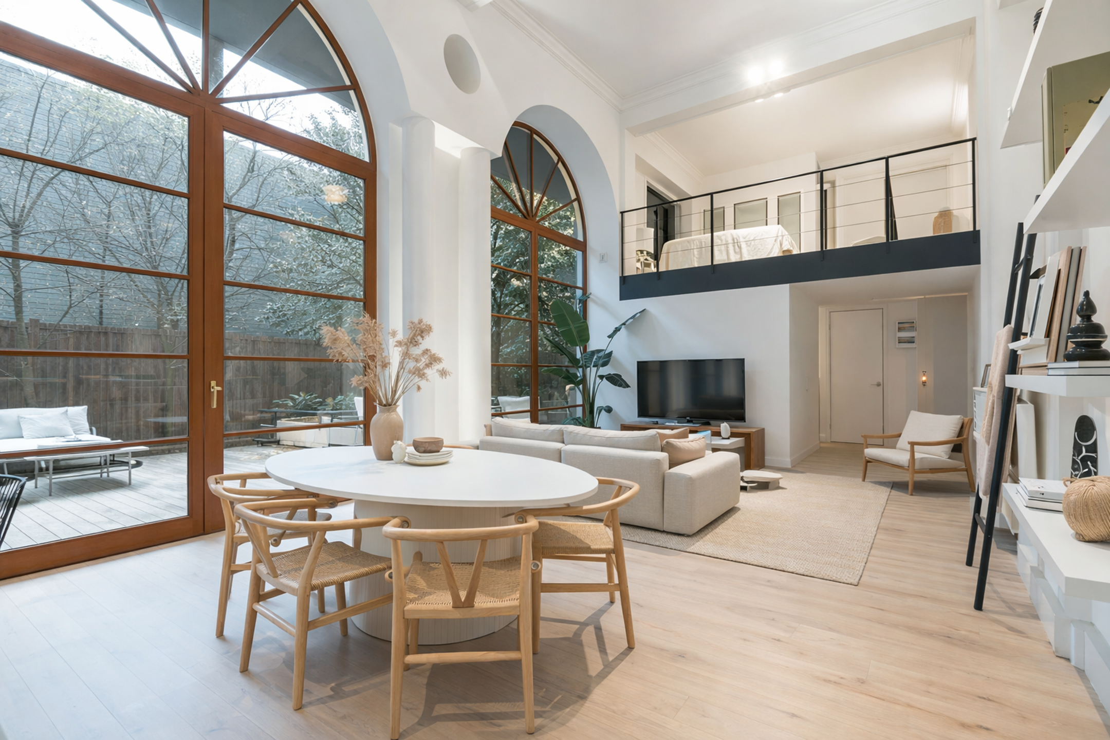 Het appartement beschikt over een ruim terras, hoge plafonds en waanzinnig raampartijen.