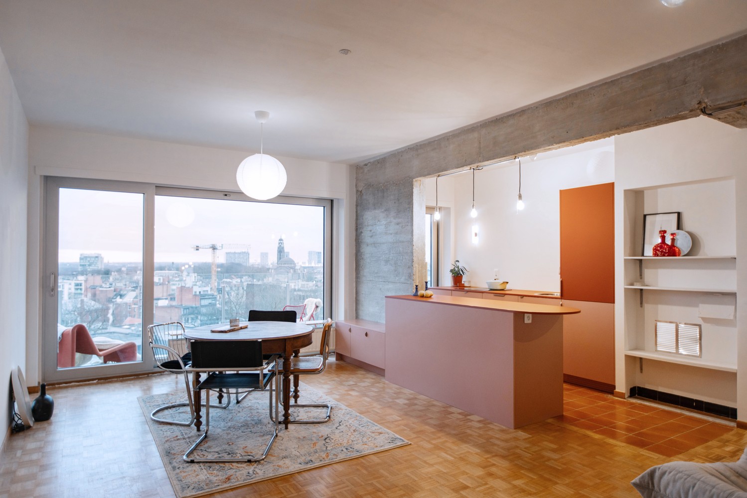 Sommige appartementen laten je meteen anders kijken. Letterlijk. Op de tiende verdieping van residentie “Den Dreihoek” ontvouwt zich een uitzicht dat reikt tot aan de haven — een levend stadsdecor met de mooiste zonsondergangen ooit. Een recente renovatie (2025) met respect voor het karakter van deze machtige 70s blok en dan weet je: dit is er zo eentje.