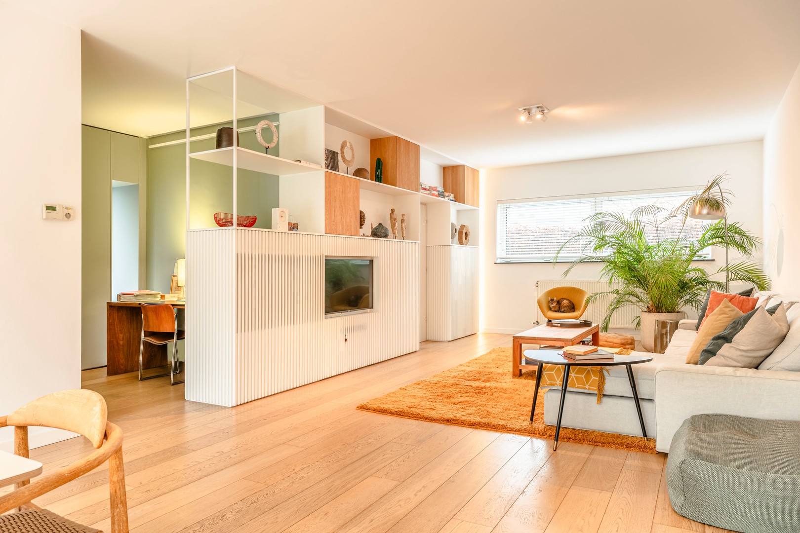 Vanuit de inkomhal komen we in de ruime leefruimte (53m2), waar de zithoek en eetplaats harmonieus in elkaar overlopen. De grote raampartijen zorgen voor een prachtig zicht op de tuin en laten overvloedig natuurlijk licht binnen. Aansluitend is er plaats voor een bureauruimte, perfect om werkmappen of een thuiswerkplek te voorzien.
