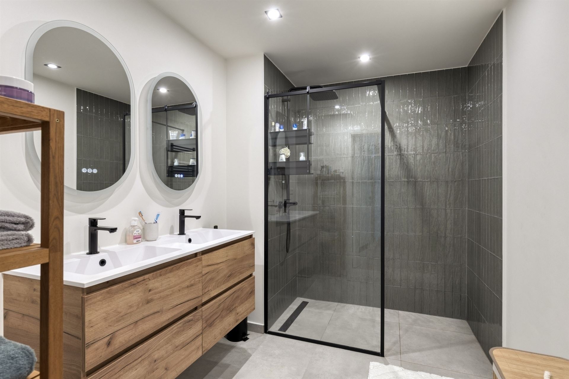 Een luxe badkamer die indruk maakt met zwarte accenten, inloopdouche, dubbele lavabo, handdoekdroger, alles tot in de puntjes afgewerkt.