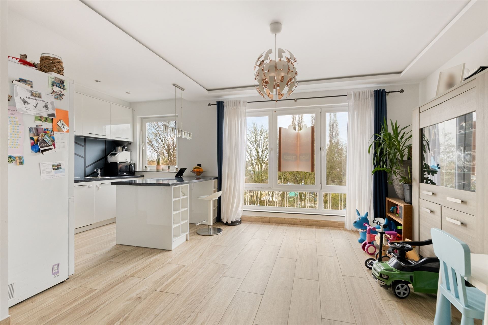 Bij het betreden van het appartement komt u in de centrale inkomhal, voorzien van een veiligheidsdeur. Van hieruit heeft u toegang tot de lichtrijke leefruimte aan de straatzijde, waar de grote raampartijen zorgen voor een overvloed aan natuurlijk licht. De open, moderne keuken sluit naadloos aan op de living en verstrekt het ruimtelijke, open karakter van het geheel.