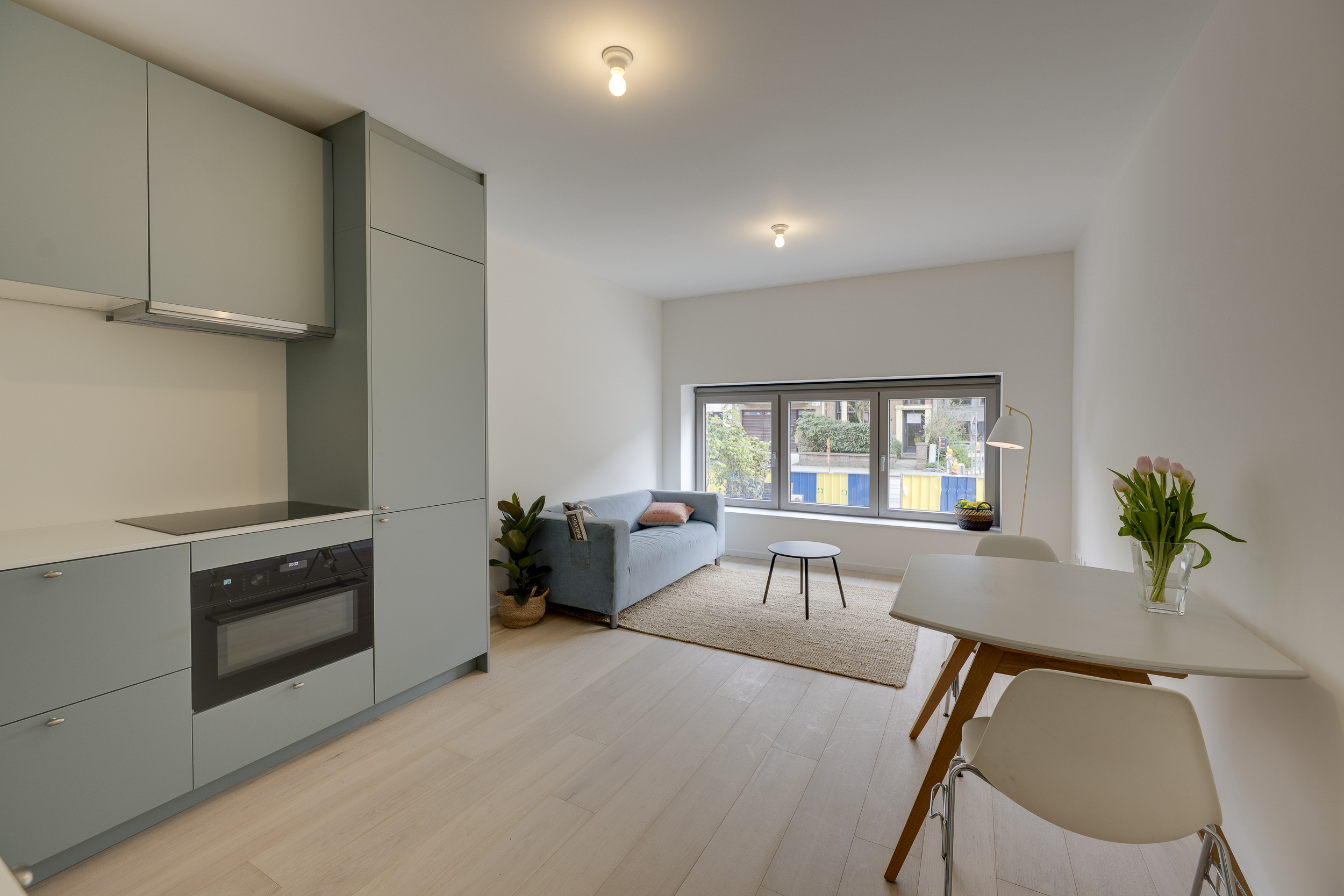 De living en eetruimte lopen mooi in elkaar over en krijgen extra ademruimte door de vorm van het appartement. De houten vloeren brengen warmte, terwijl het geheel licht en open blijft aanvoelen. De keuken sluit hierop aan, praktisch en klaar voor gebruik, zonder dat het de ruimte overneemt. Alles zit waar het moet zitten.