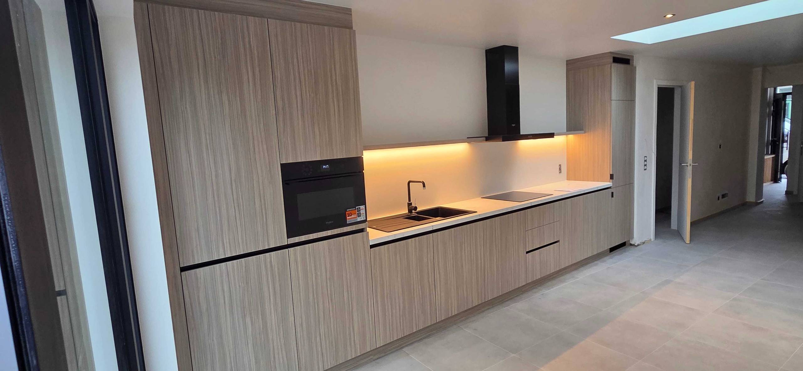 Gelijkvloers: inkom, berging, wasplaats, badkamer, living en zeer ruime keuken.