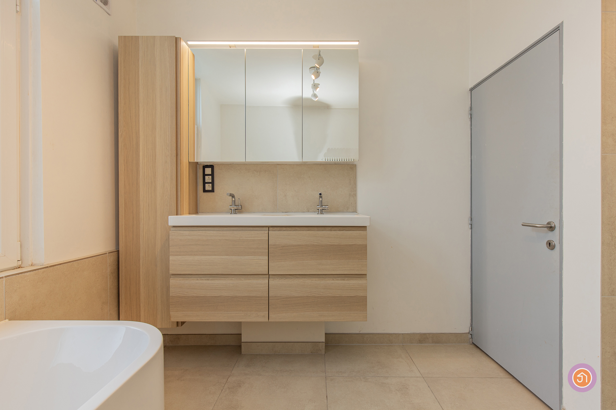 We komen binnen via de inkomdeur die toegang geeft tot de ruime leefruimte van 27 m². Aansluitend hebben we de volledig geïnstalleerde keuken met daarnaast een praktische berging. De badkamer is volledig vernieuwd en beschikt over een dubbele douche, bad en een dubbele lavabo.