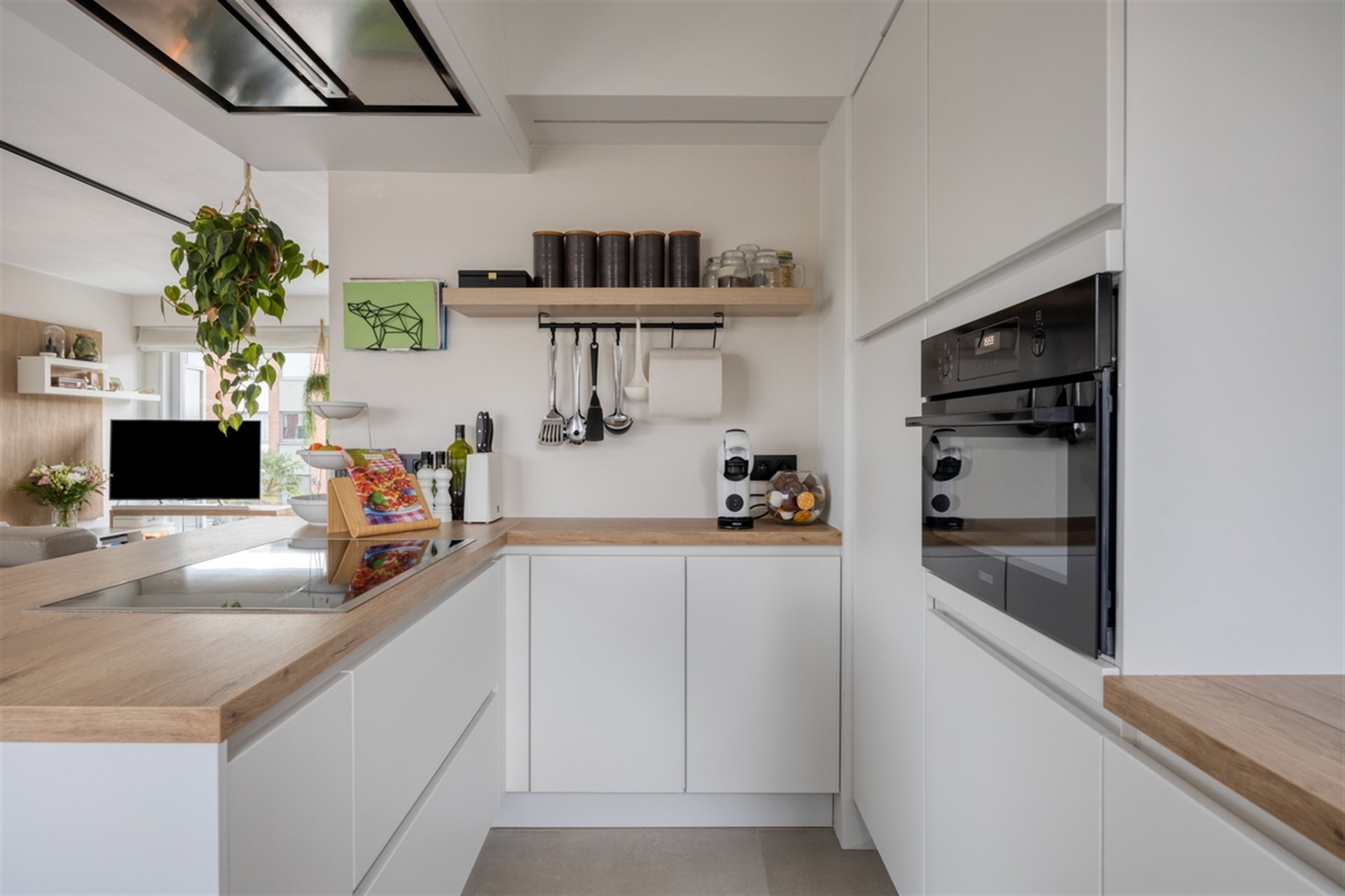 Le premier étage constitue le cœur de la maison et surprend avec un espace de vie lumineux sur un sol carrelé, où l'espace et la lumière sont essentiels. Cet espace de vie confortable équipé d'un poêle à pellets se connecte agréablement à la cuisine ouverte, qui est entièrement équipée d'un îlot de cuisine élégant, d'un four combiné et d'une plaque de cuisson à induction.