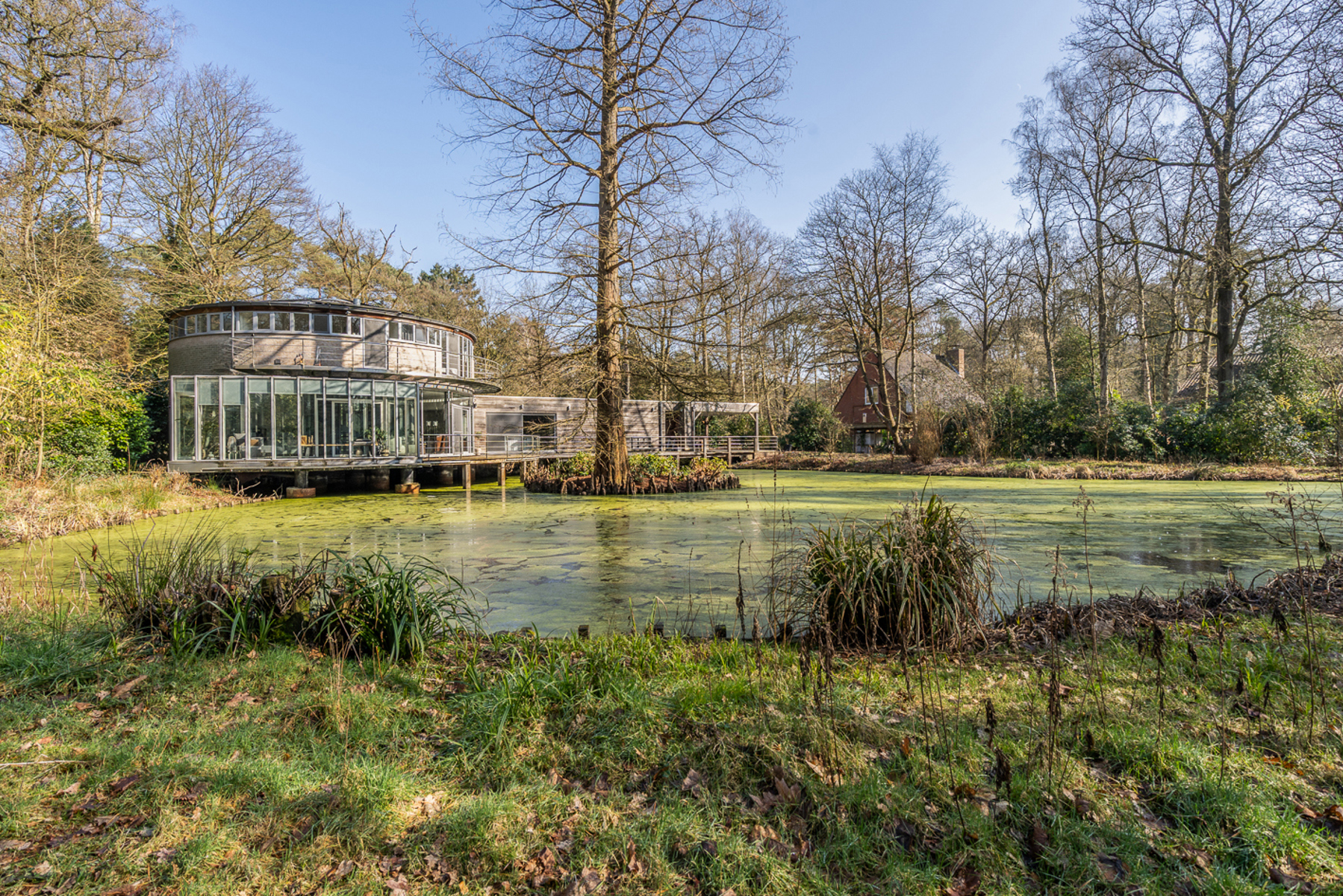 De woning is ontworpen door het gekende Architectenbureau Luc Denis uit Antwerpen. De natuurlijke vijver en het omringende bos was voor de architect aanleiding een hoofverblijf met een ronde vorm te creëren met daaraan een rechthoekige uitbouw met de ruimtes die aanvullend aan de woonfunctie zijn.