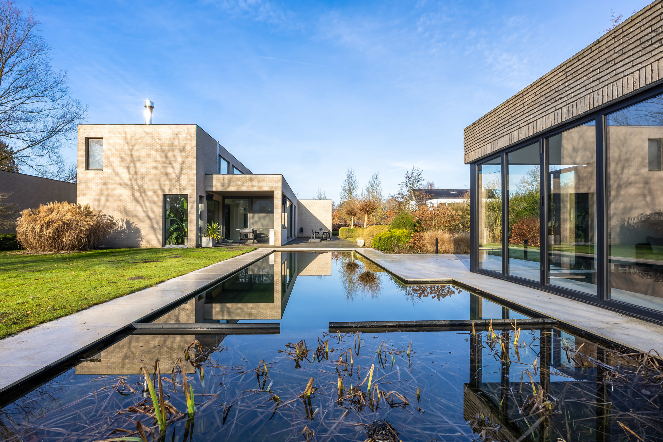 Exclusieve moderne villa met zwemvijver in een groene omgeving