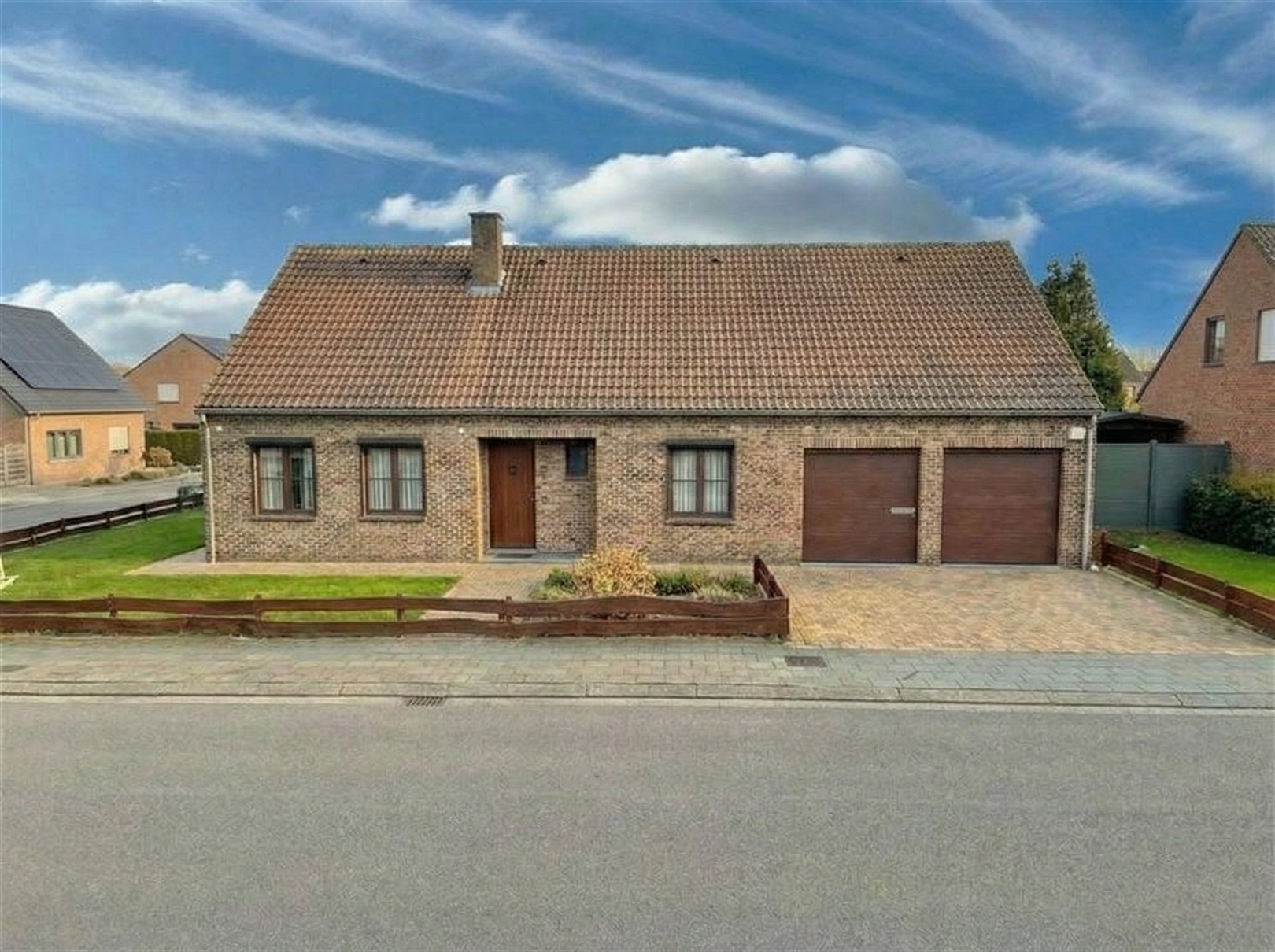 Le rez-de-chaussée se compose d’un hall d’entrée avec une première toilette, d’un séjour lumineux de 45 m² avec feu décoratif, d’une cuisine, d’un hall de nuit, de deux chambres à coucher, d’une salle de bains équipée avec une douche, une deuxième toilette et un double lavabo, ainsi que d’un grand garage intégré pouvant accueillir deux voitures et doté d’une porte sectionnelle automatique. Depuis le garage, un escalier escamotable fixe donne accès au premier étage, où se trouve actuellement un grenier de rangement d’environ 64 m² offrant un important potentiel d’aménagement, pouvant être transformé en chambres supplémentaires, une seconde salle de bains et/ou un espace polyvalent.