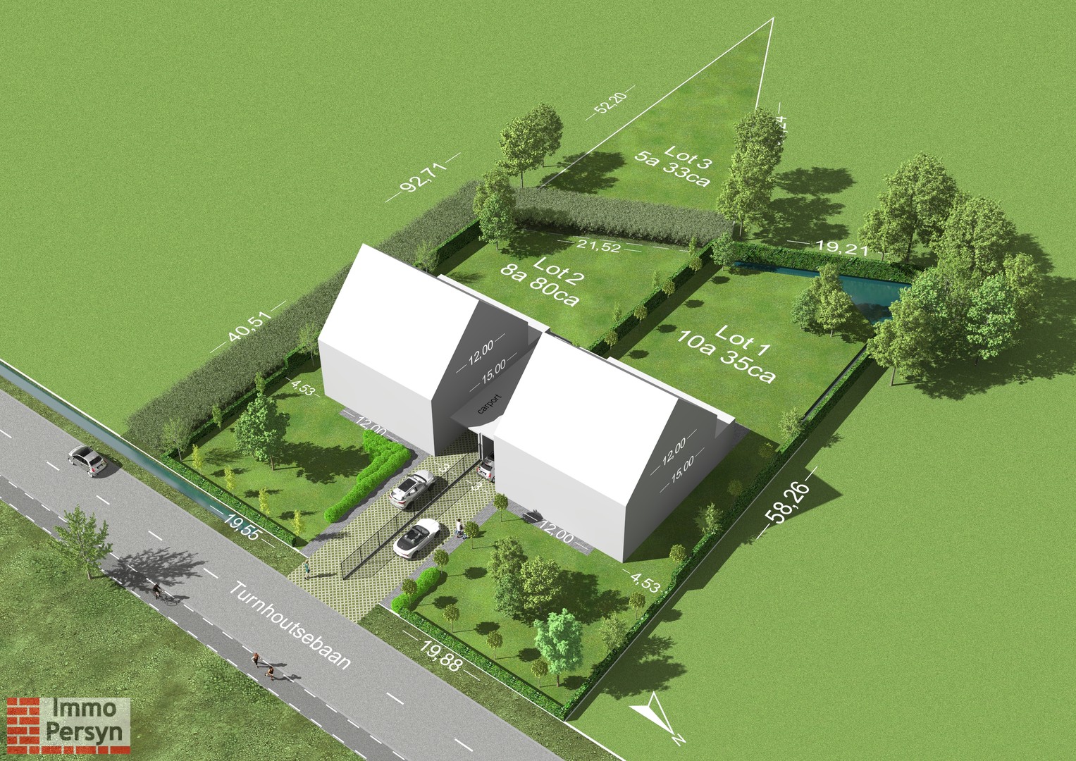 Lot 2+ lot 3 op de verkaveling heeft een totale straatbreedte van 19,55m en een diepte van +/- 92m.