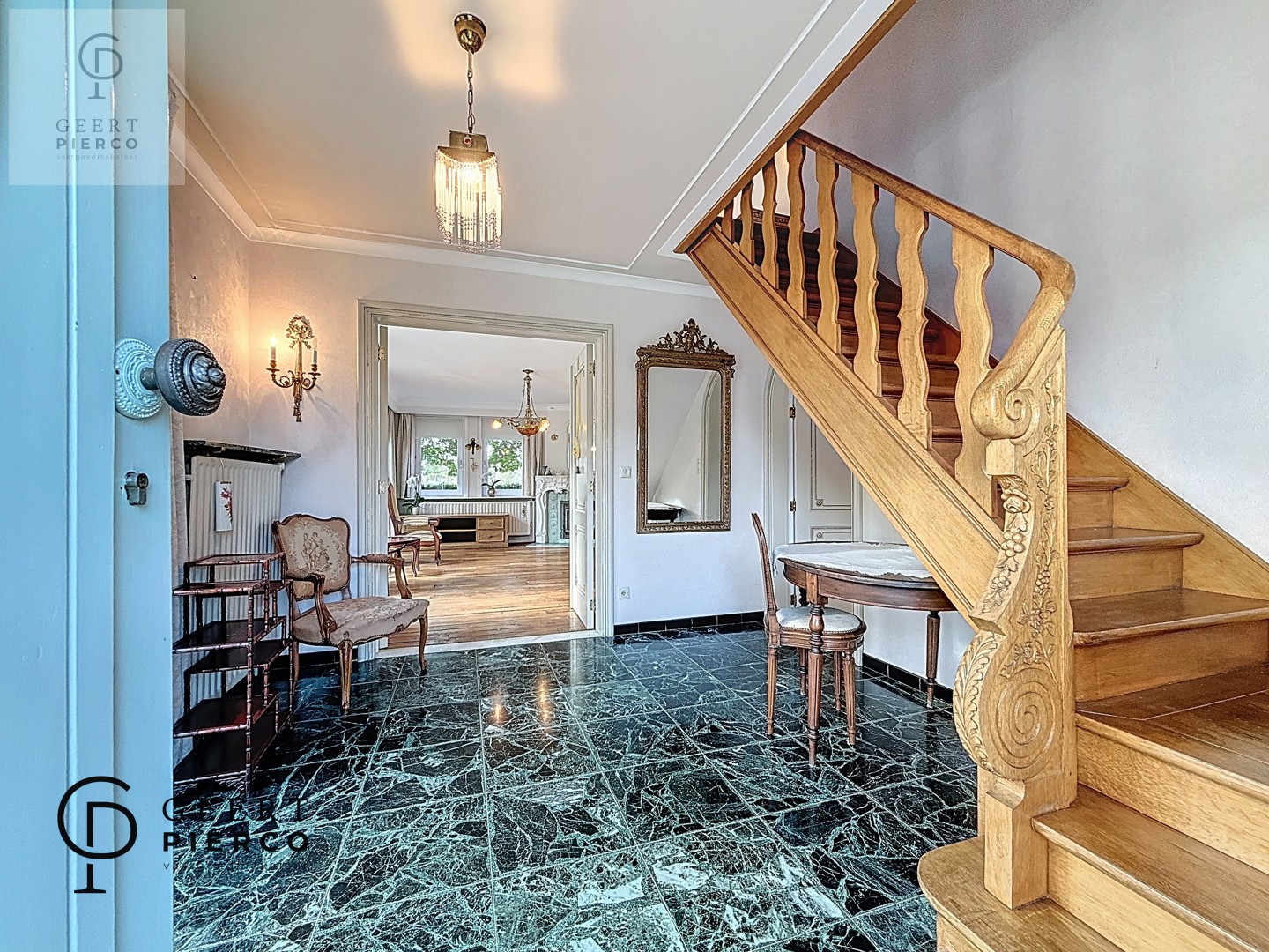 Via de voordeur met loodglas betreden we de woning. De statige inkomhal zet meteen de toon en nodigt uit om verder te ontdekken.