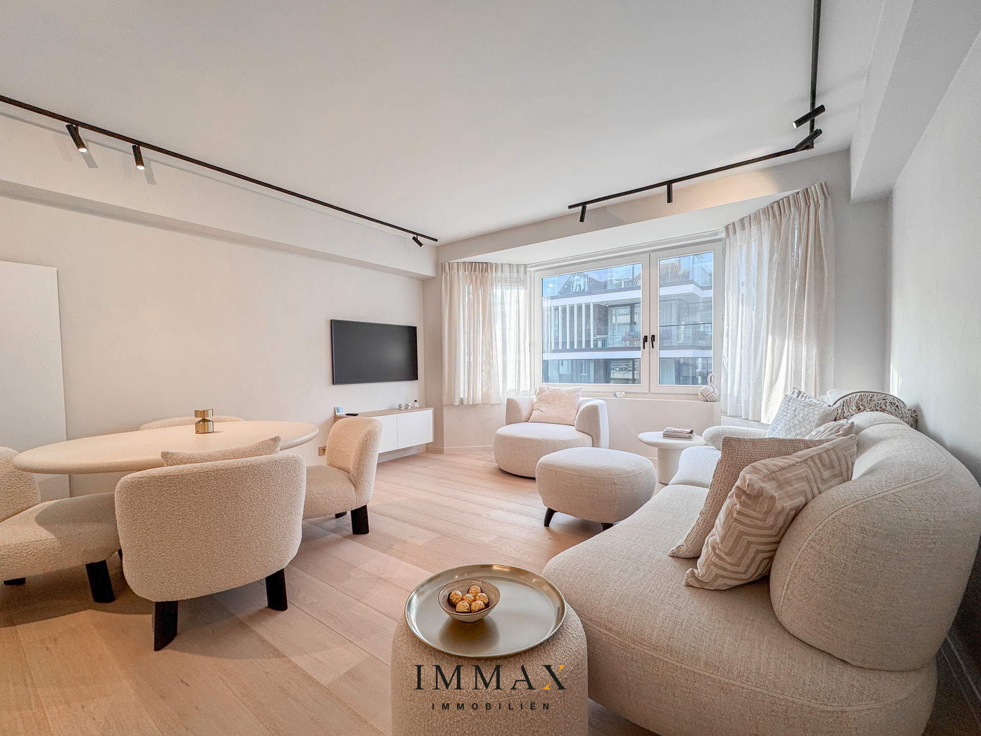 Cet élégant appartement rénové de deux chambres est situé sur le boulevard Léopold à Knokke, dans un immeuble calme et bien entretenu, à quelques pas de la digue et à proximité immédiate du boulevard Lippens. Le hall d'entrée donne accès à un espace de vie lumineux avec un agencement ouvert et harmonieux, adjacent à une cuisine moderne entièrement équipée d'appareils Siemens et Bora de qualité. Les deux chambres sont équipées d'armoires encastrées. La chambre principale peut accueillir un lit double, tandis que la deuxième chambre peut accueillir un lit de 140 x 200 cm ou un lit superposé. La salle de bains élégante est finie avec des matériaux de haute qualité et dispose d'une douche à l'italienne à effet pluie et d'un lavabo. Il y a également des toilettes séparées. La rénovation récente a été réalisée avec le souci du détail et du confort, avec notamment des finitions en mortex, du vitrage à haut rendement et un chauffage infrarouge économe en énergie avec réglage individuel via une application.