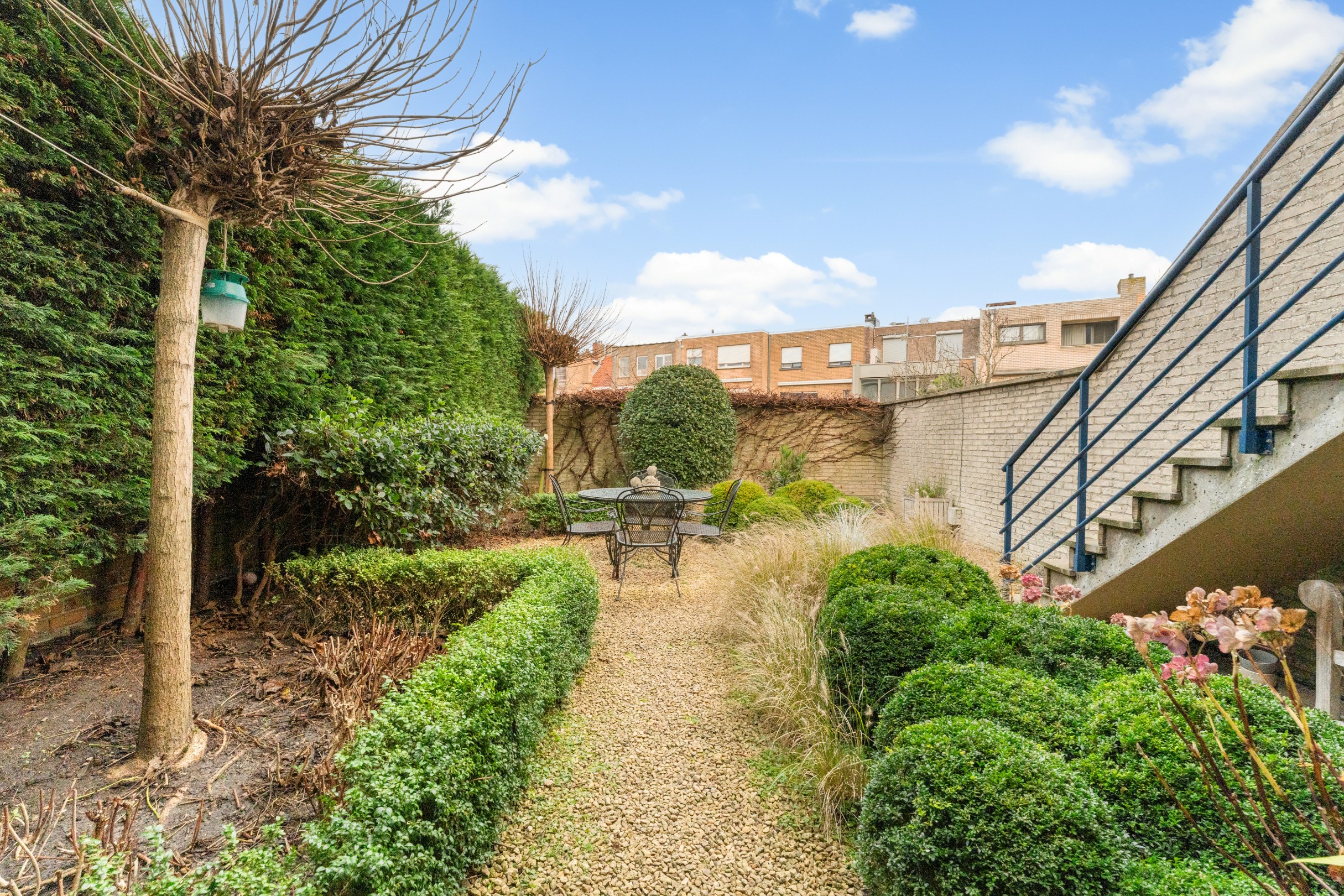 Op het gelijkvloers bevindt zich een ruime inkomhal met vestiaire, een grote inpandige garage met aansluitende wasplaats en bijkeuken, beiden voorzien van ingebouwde kasten. Verder is er een badkamer met douche en toilet en een praktische berging onder de trap. Achteraan de woning een fraai aangelegde tuin die geniet van ochtend- en avondzon.