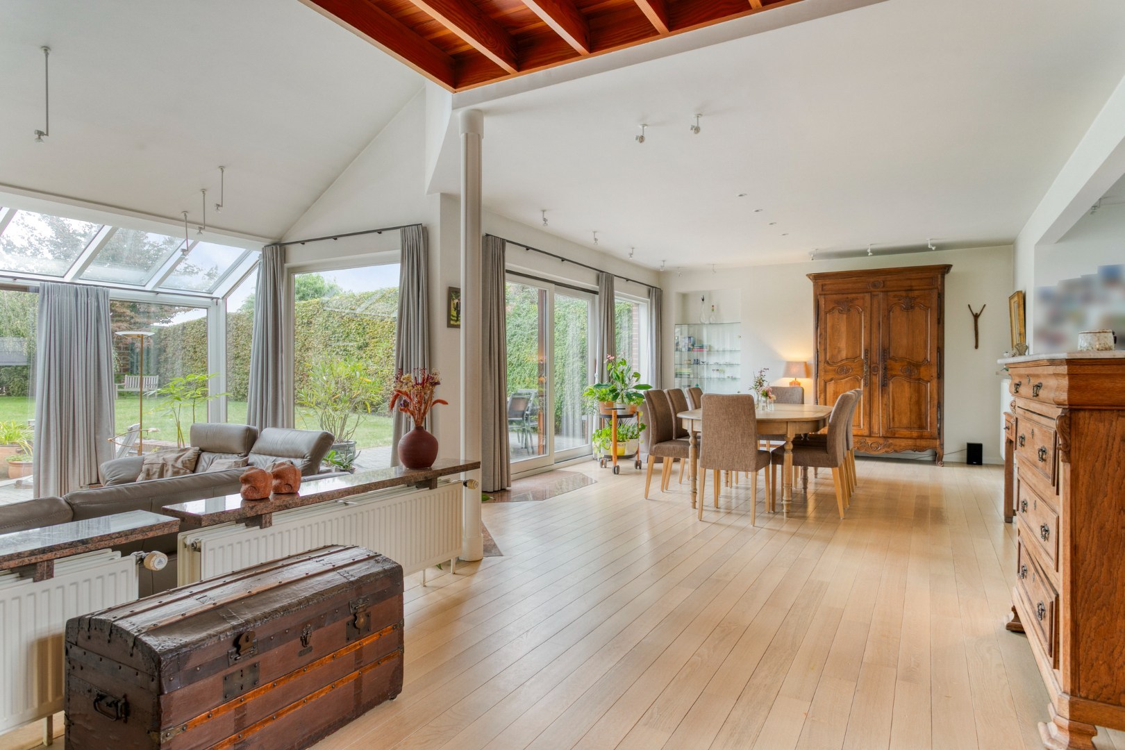 De eetkamer met pianohoek is heel ruim en biedt eveneens een schitterend zicht op de tuin.