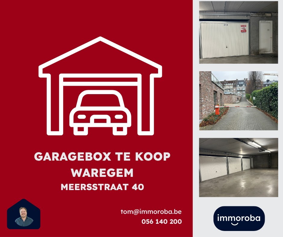Garagebox te koop in het centrum van Waregem die gelegen is in de 'residentie Binnentuin'. Toegankelijk via de Meersstraat (overkant 'Treffer') en die beveiligd is met slagboom & gemeenschappelijke elektrische poort. Garage (nr 212) die zelf is voorzien van een manuele poort. Kan gebruikt worden als opslagruimte of als garage (1 wagen).