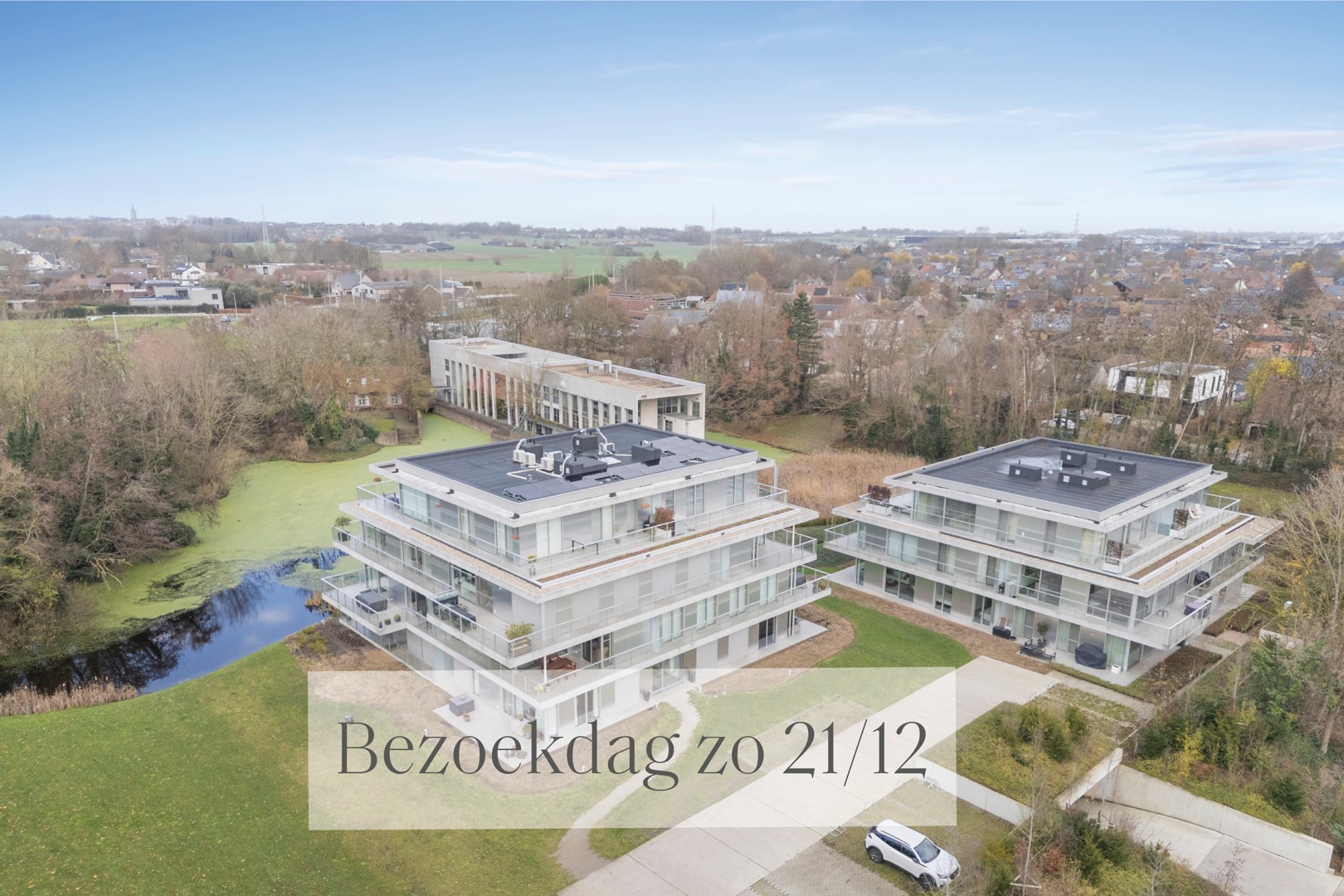 Indeling: inkomhal met ruimte voor vestiaire / toilet met wastafel / twee ruime slaapkamers / volledig uitgeruste badkamer / ruime leefruimte met open keuken voorzien van kookeiland en alle nodige toestellen / technische ruimte/berging / riant terras (29m²) uitgevend op parktuin/vijver