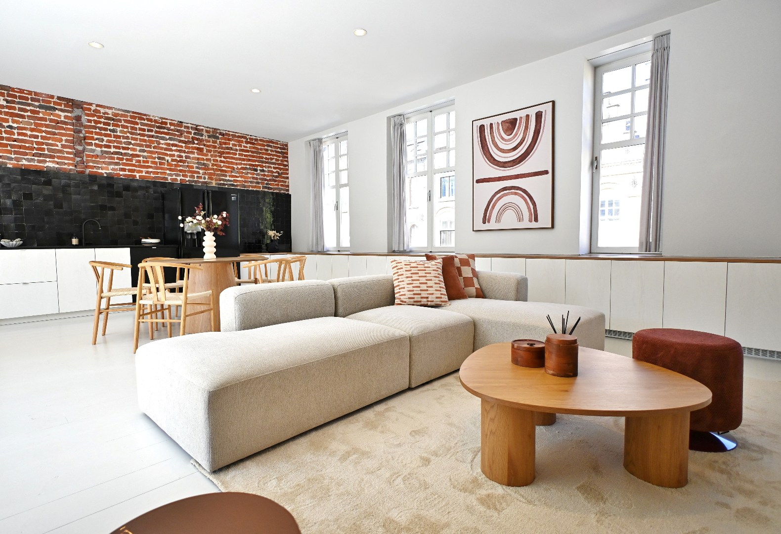 De eerste verdieping verrast met een open leefruimte in loftstijl, waar grote raampartijen en authentieke elementen zorgen voor een prachtige sfeer en overvloedige lichtinval. Vanuit deze leefruimte heeft u toegang tot een ruim, zonnig terras, ideaal om in alle rust te genieten. De stijlvolle, volledig ingerichte keuken sluit naadloos aan bij de leefruimte en biedt bovendien een uniek zicht op de Sint-Maartenskerk.