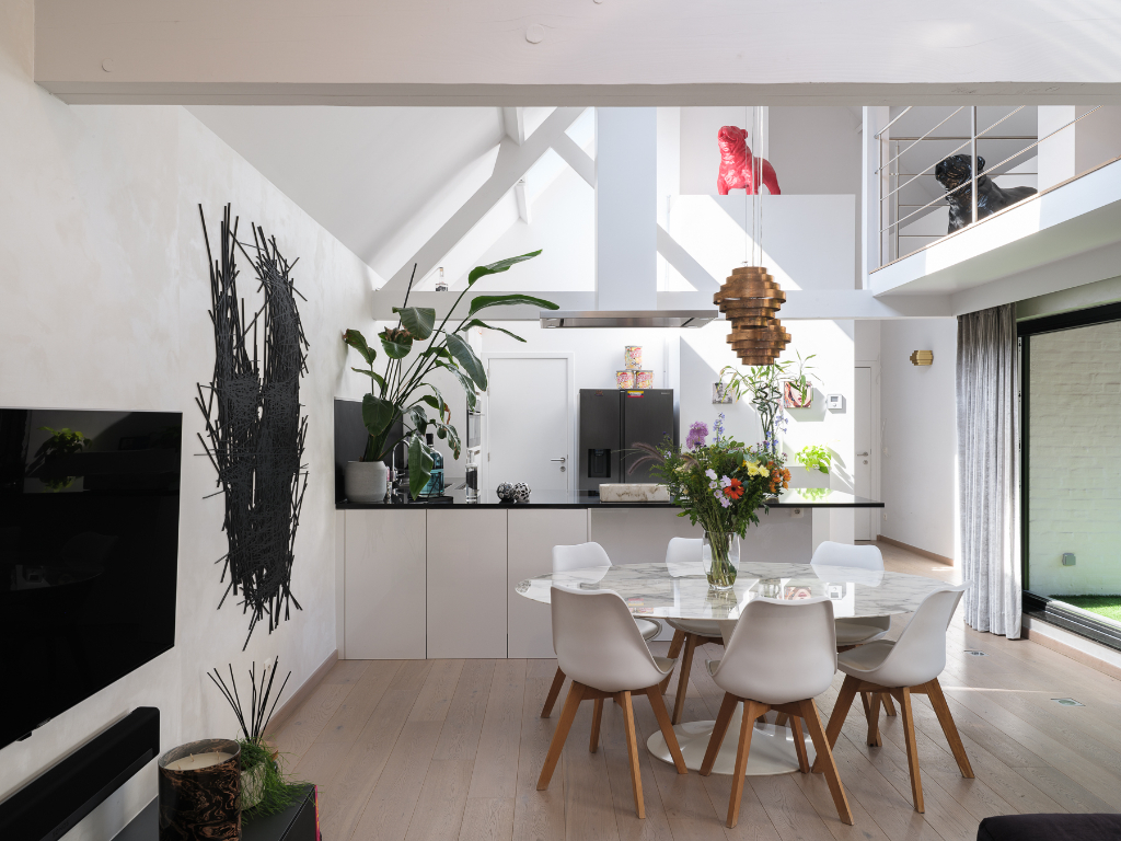 De hoge plafonds, het indrukwekkende dakgebinte en de vele raampartijen zorgen voor een bijzondere woonbeleving en overvloedige lichtinval.