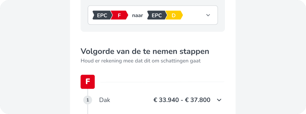 Je zinnen gezet op een charmante woning met een minder goeie EPC-score? Voortaan tonen we jou in samenwerking met onze partner Setle de geschatte renovatiekosten om je woning te upgraden naar een EPC-score D, of stilaan richting A.