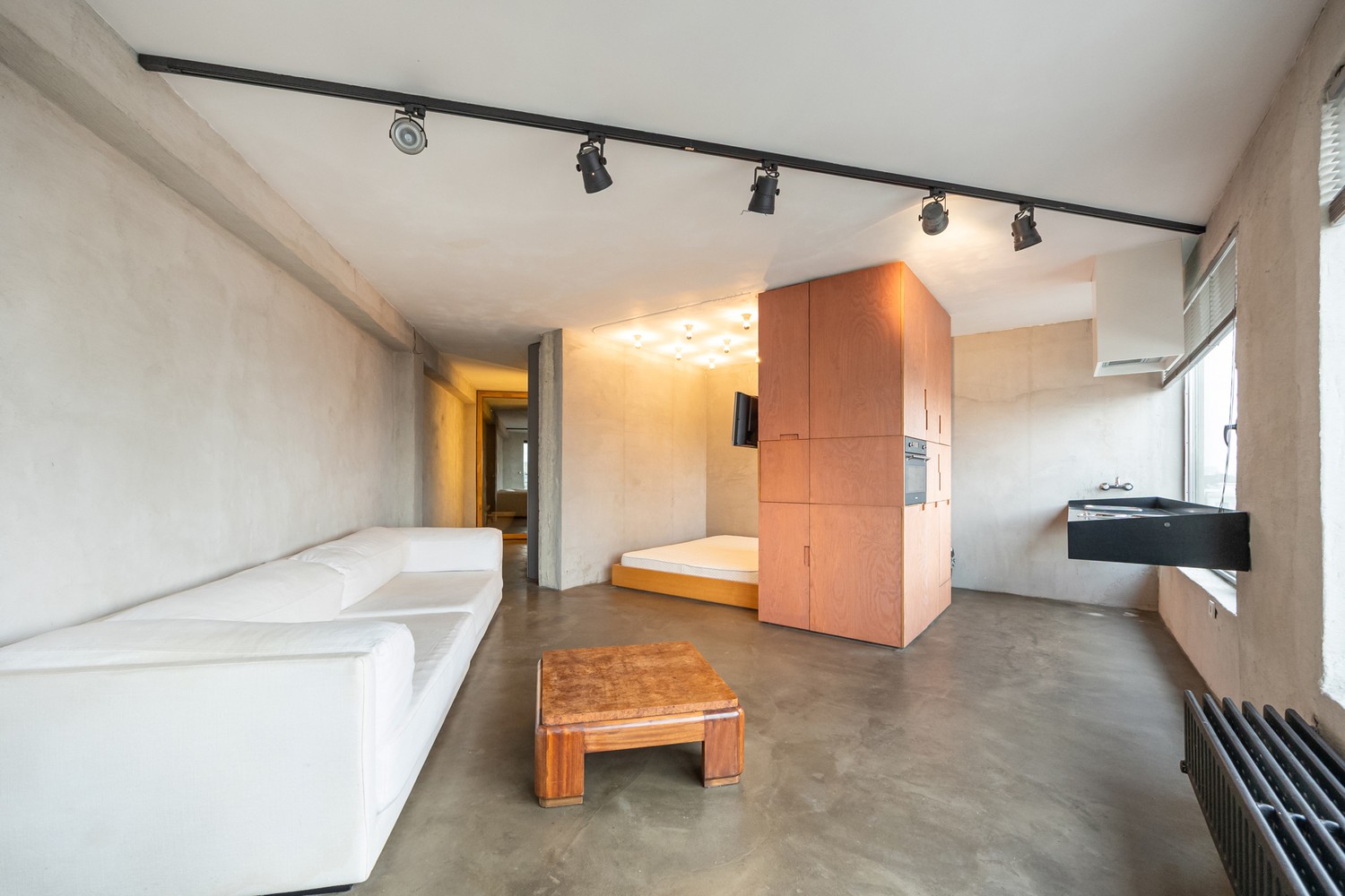 De studio beschikt bovendien over verrassend veel opbergruimte dankzij slim geïntegreerde maatkasten.