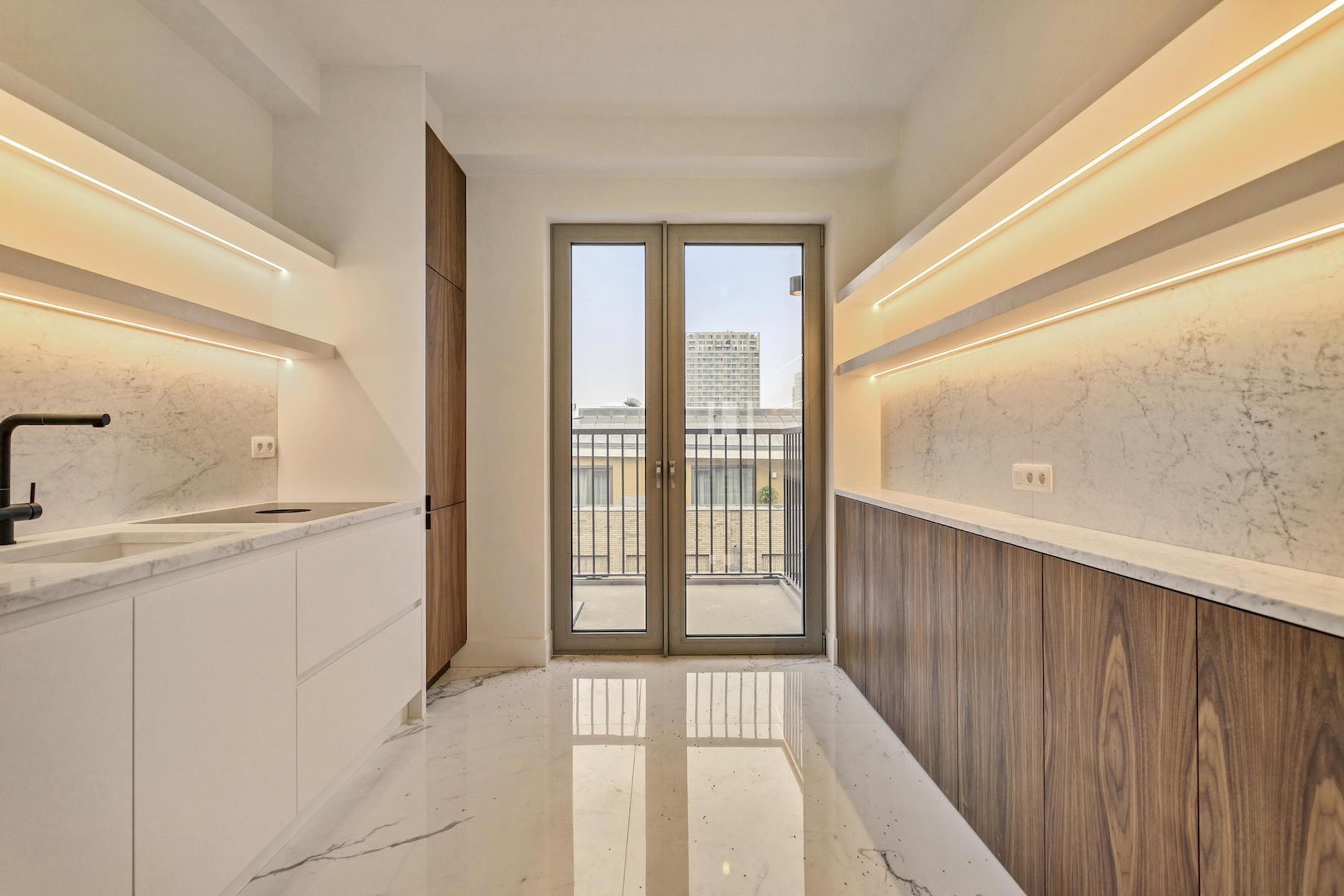 Vervolgens beschikt het appartement over een hoofdslaapkamer met ingemaakt kastenwerk en een tweede slaapkamer. De luxueuze badkamer, eveneens afgewerkt met marmer en notelaar, is uitgerust met dubbele wastafel, toilet en douche.