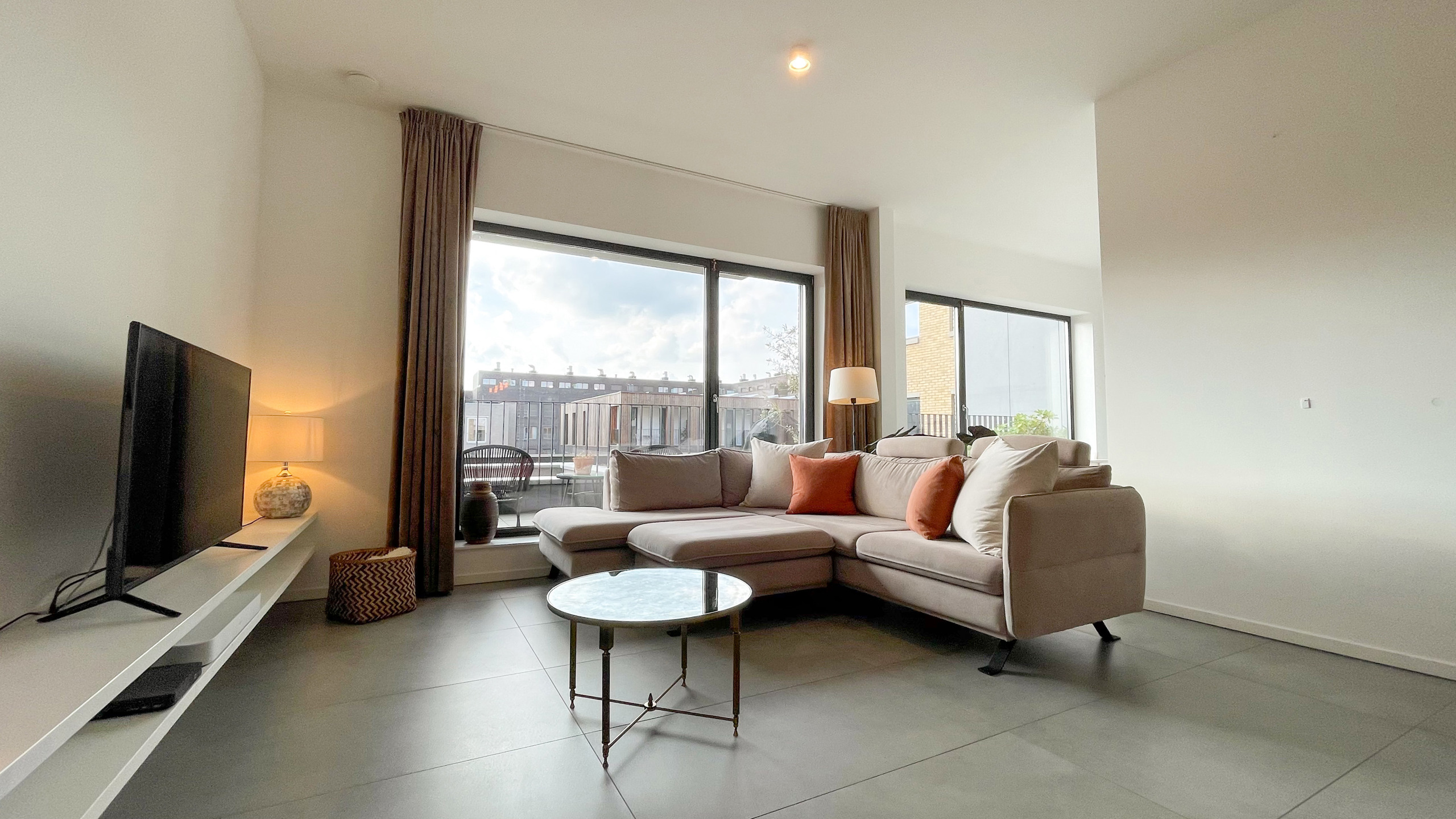 De leefruimte is gelegen aan de achterzijde van het appartement en geniet bijgevolg van een ideale zuidwestelijke oriëntatie. Dankzij de grote raampartijen baden de leefruimte en keuken in het licht. Aansluitend is een gezellig terras voorzien van ca 12 m² waar u zorgeloos kan genieten van de middag- en avondzon.