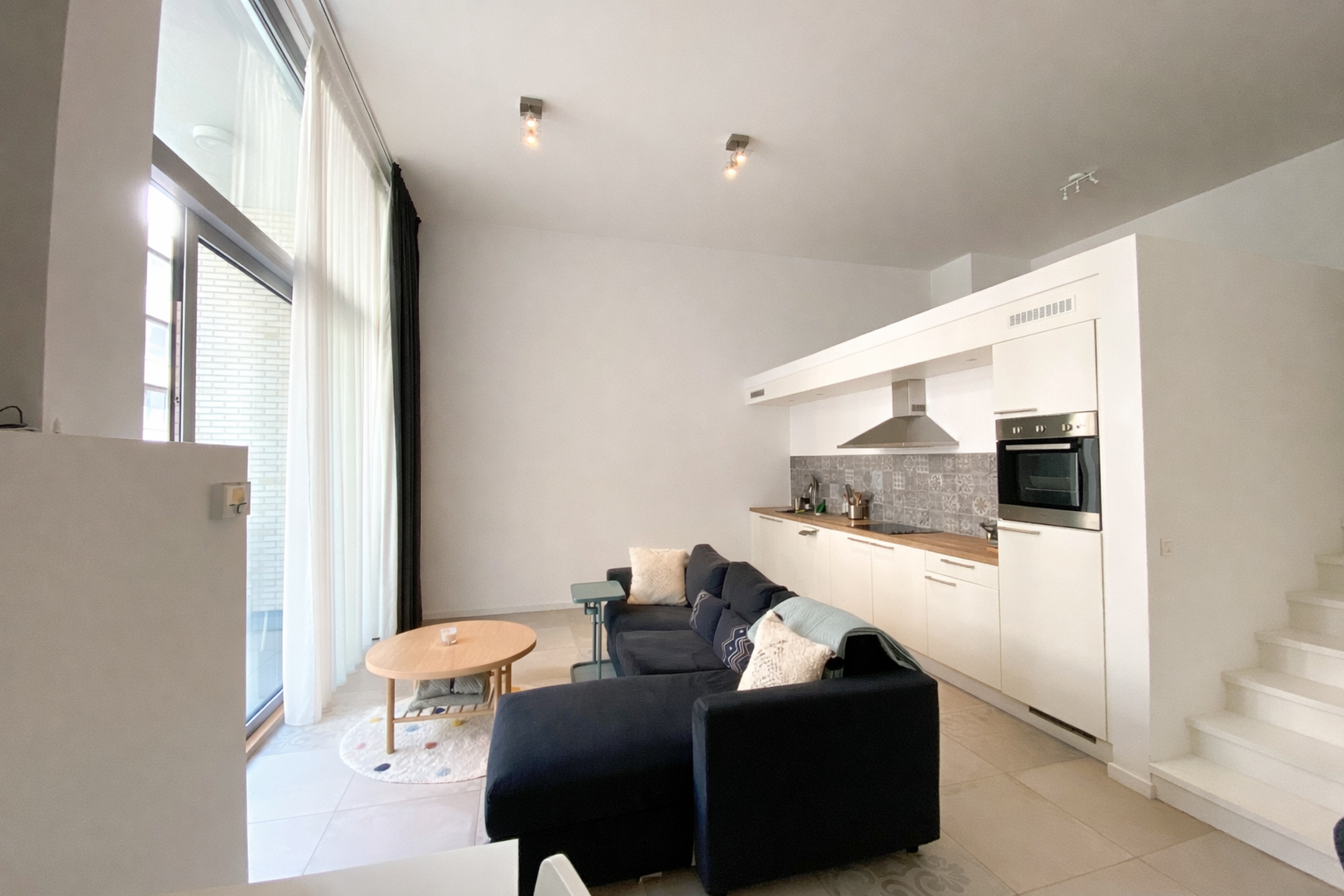 Via een private inkomdeur komt u in de inkomhal die perfect dienst kan doen als vestiaire. Aansluitend bevindt zich de leefruimte met open keuken. Deze is voorzien van alle nodige toestellen: oven, koelkast met vriesvak, kookvuur en vaatwasser. De mooie wandtegeltjes en ook de unieke tegelvloer geven de ruimte net die extra gezellige touch. Openheid en licht zijn hier troef, dankzij de grote raampartijen langs de straatkant, die uitgeven op het gezellige terras van ca 6 m².