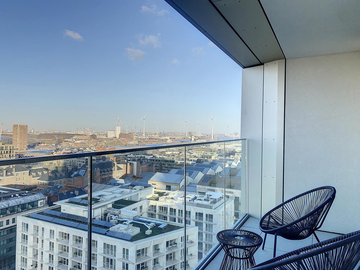 Indeling: Inkom met apart gastentoilet, woonkamer met veel lichtinval en een zonnig terras, volledig geïnstalleerde keuken, berging met voorziening voor wasmachine en droogkast, hoofdslaapkamer met ingebouwde dressing, 2de slaapkamer te gebruiken als buroruimte. Een leuke extra is het gemeenschappelijke dakterras op de 23ste verdieping waar u geniet van een spectaculair stadszicht. Individuele kelderberging. Verder is het appartement volledig voorzien van o.a. TV, stofzuiger, wasmachine en droogkast, huisraad,...