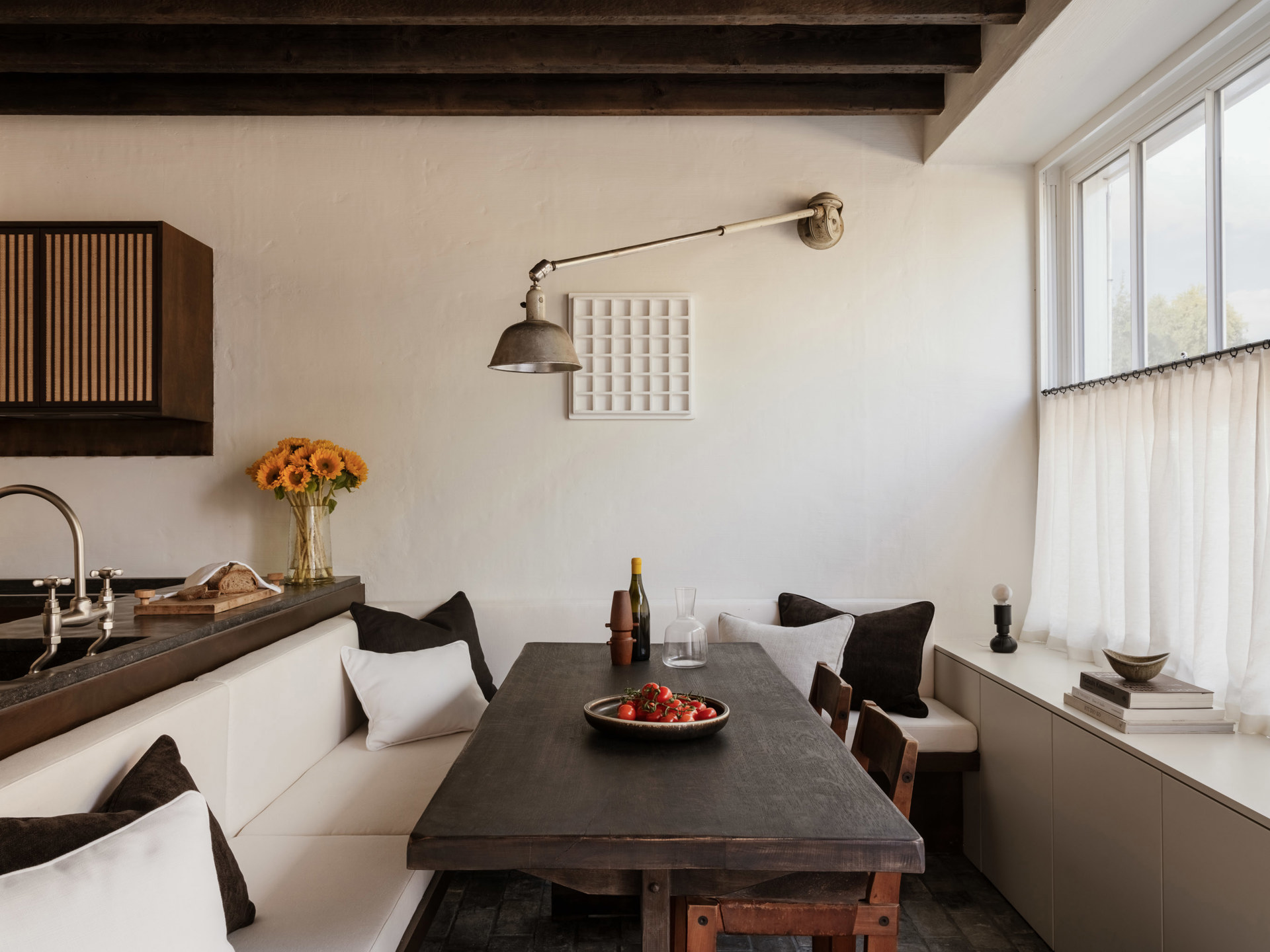 De woning wordt betreden via het gelijkvloers, waar zich de keuken en eetruimte bevinden. De keuken werd uitgewerkt in een sobere, warme materialiteit en is uitgerust met kwalitatieve toestellen, waaronder een Miele combi-oven en Miele stoomoven. Aansluitend bevindt zich een gezellige zithoek, die mee opgenomen werd in deze leefruimte en zorgt voor een intieme, uitnodigende sfeer. De grote raampartij aan straatniveau versterkt bovendien de connectie met de omgeving en laat het natuurlijke daglicht rijkelijk binnenstromen.