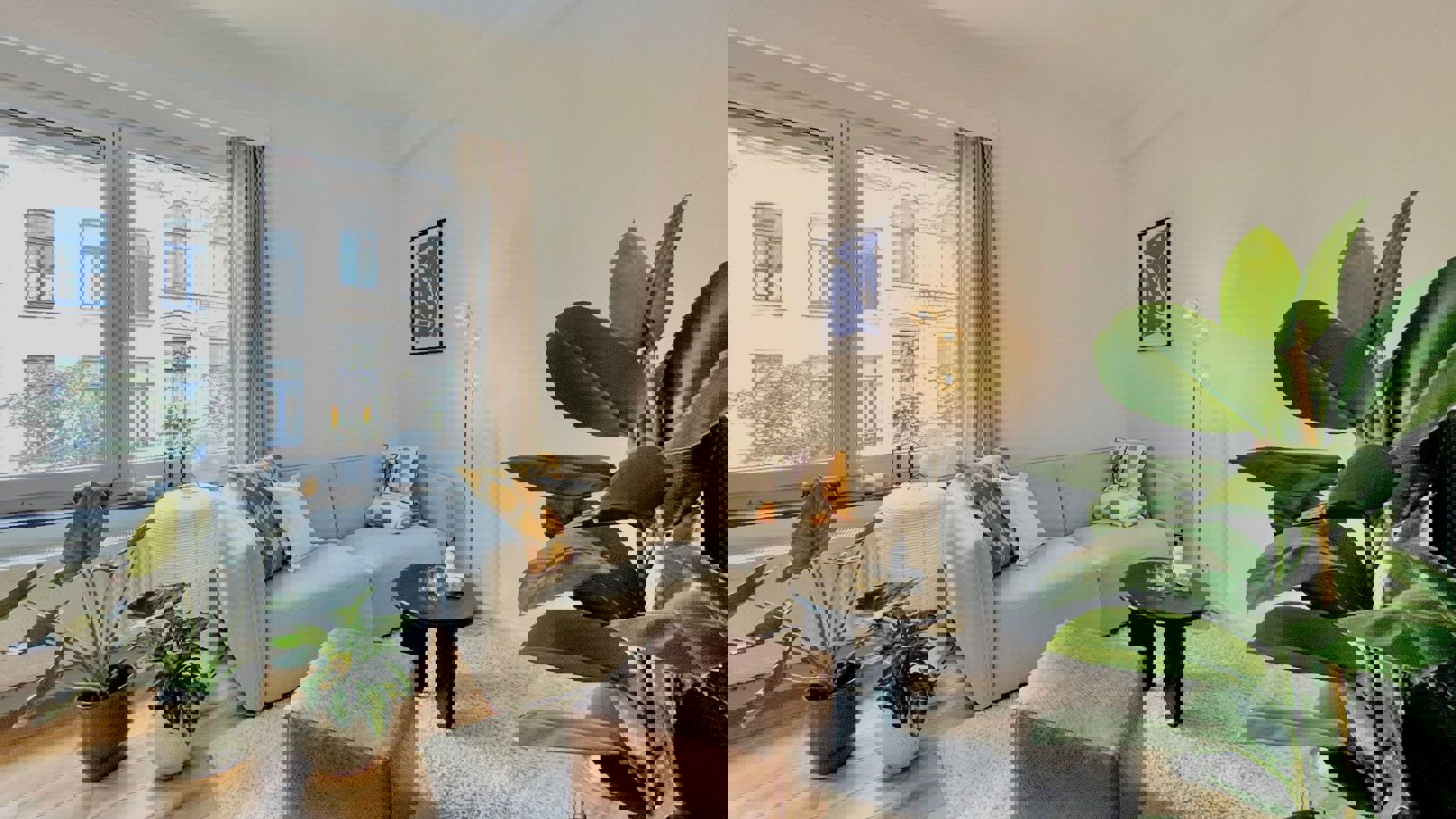 U komt binnen in de aangename en lichtrijke leefruimte. Dankzij een doorgedreven en structurele renovatie is dit appartement werkelijk een topper. Het appartement is doorlopend afgewerkt met kwalitatieve topmaterialen. Zo is het gelegen op een mooie parketvloer. De hoge raampartijen zorgen voor een aangename lichtinval.